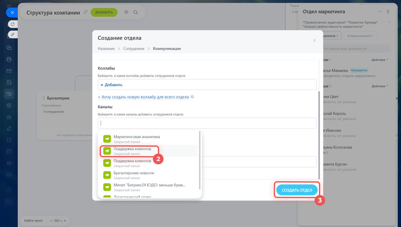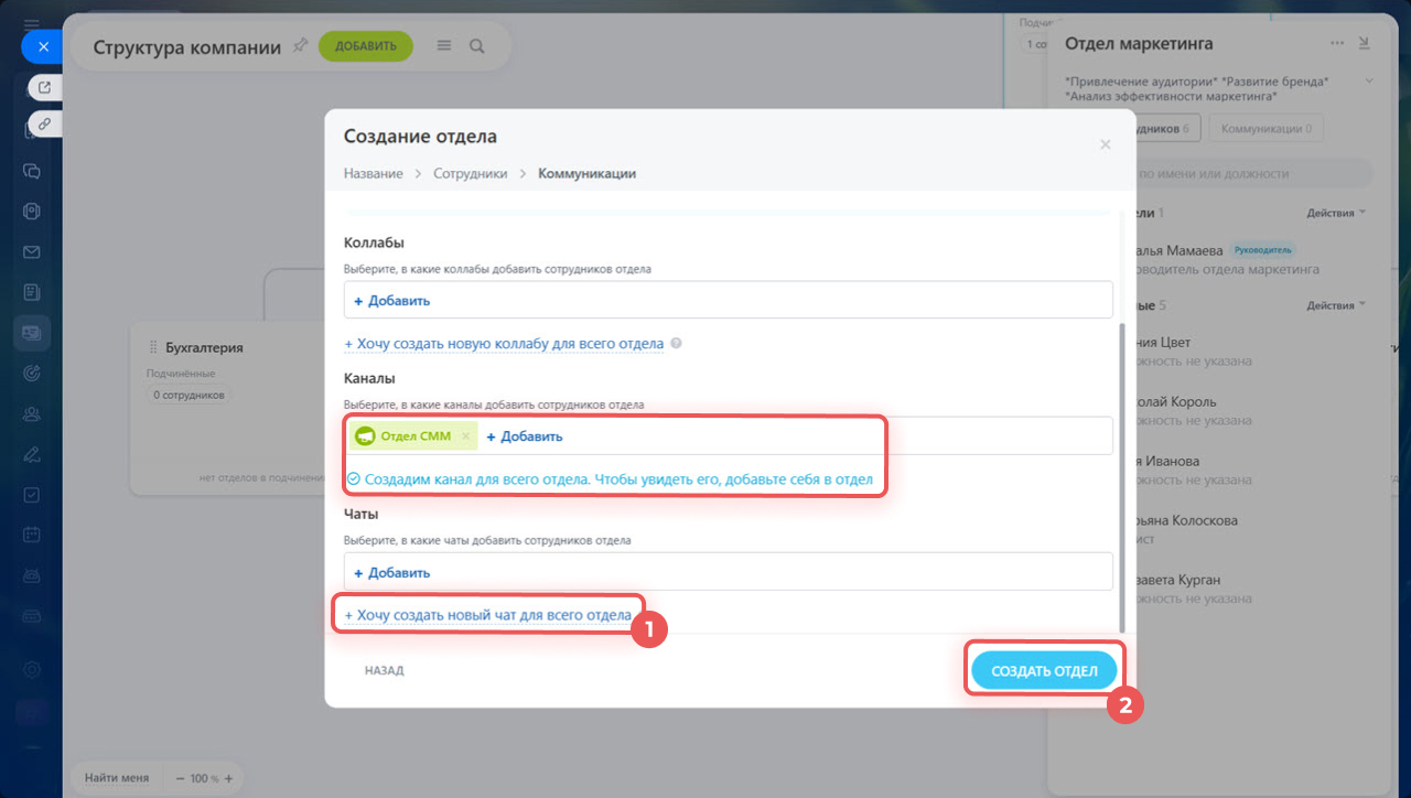 При создании отдела в структуре компании вы можете сразу добавить его сотрудников в нужные чаты, каналы и коллабы.
