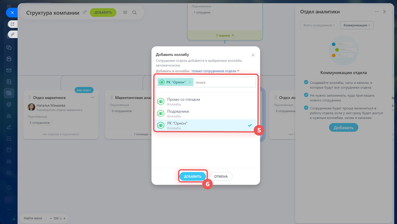 2-4. Нажмите Коммуникации > Добавить > Добавить коллабу в карточке отдела справа.