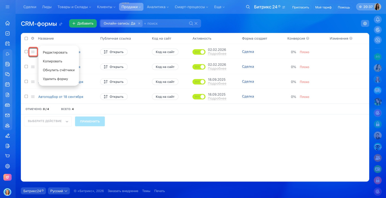 Созданные формы находятся в разделе Онлайн-запись > Каналы продаж > Все формы. Чтобы изменить форму, нажмите Меню (≡) > Редактировать рядом с нужной.