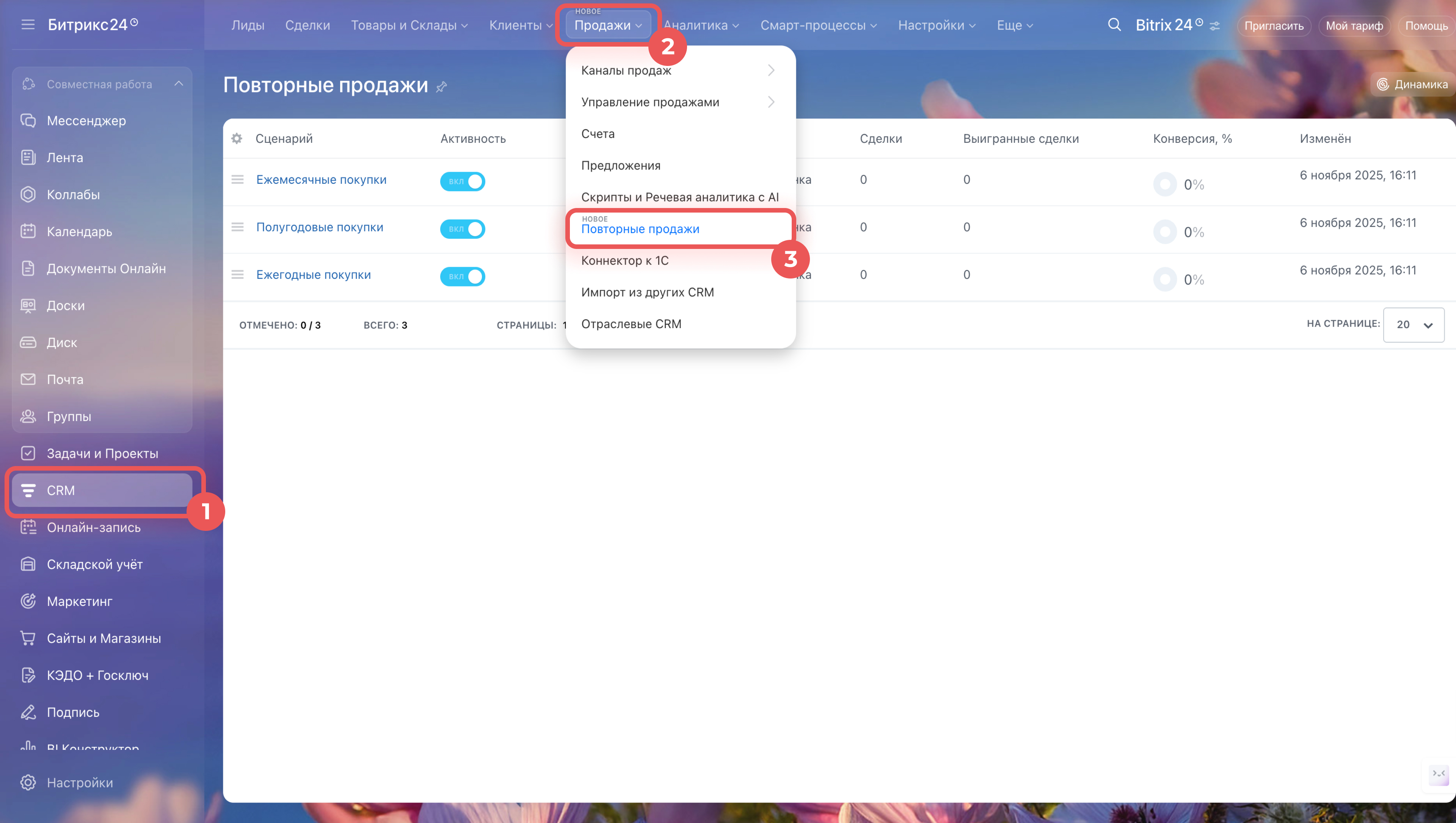 1–3. Перейдите в CRM > Сделки > Повторные продажи.