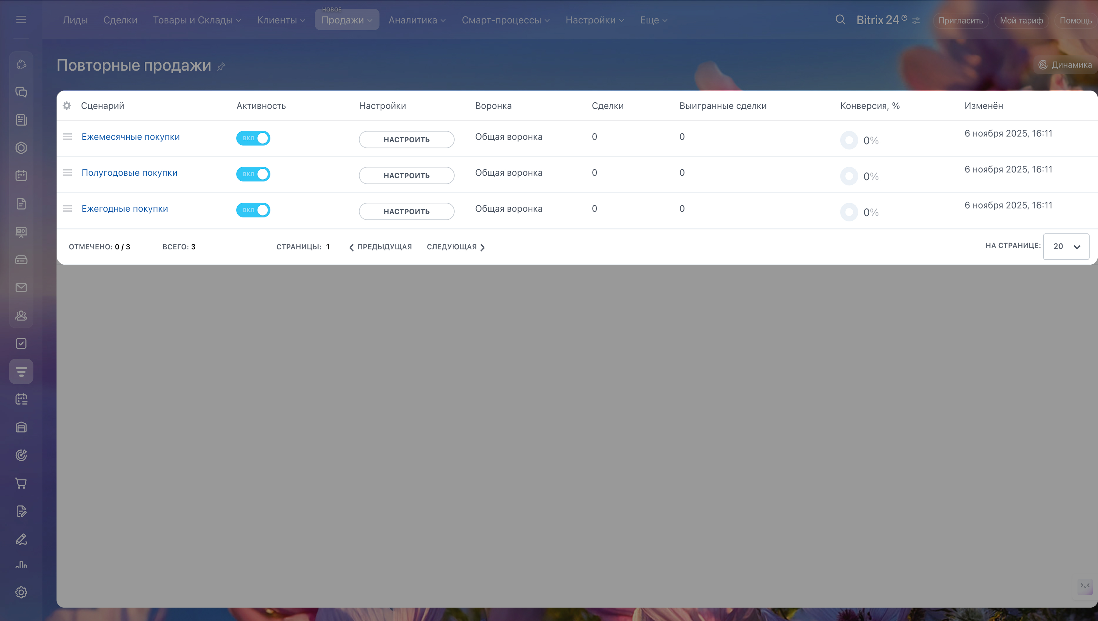 - Перейдите в CRM > Продажи > Повторные продажи и выберите, по каким сценариям будут автоматически создаваться повторные сделки: ежемесячные, полугодовые или ежегодные покупки.