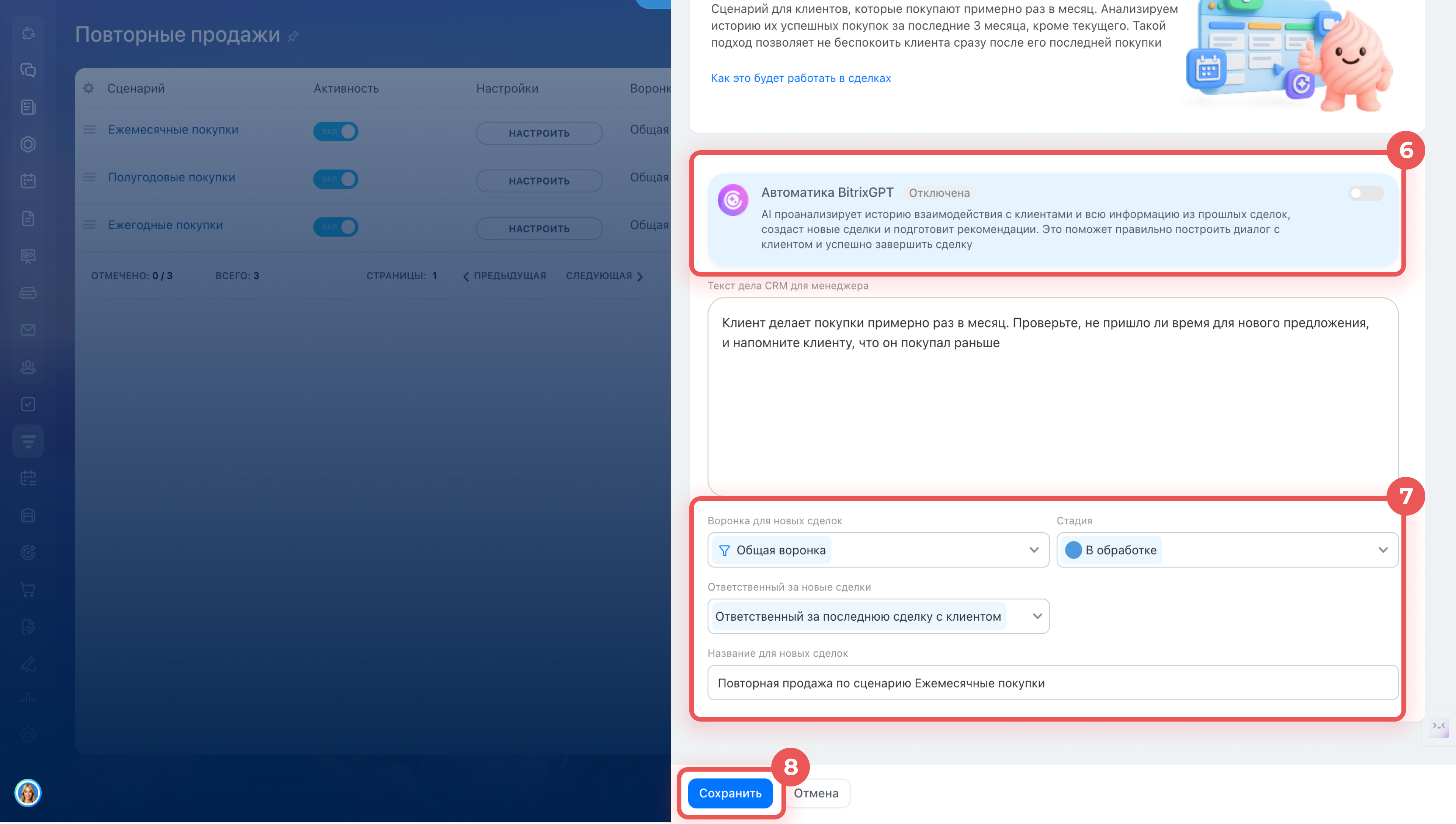 4. Выберите, какие из сценариев сделать активными. По ним AI будет автоматически создавать сделки. Например, если включен только сценарий Полугодовые покупки, AI будет искать таких клиентов и формировать для них повторные сделки. Остальные сценарии работать не будут.