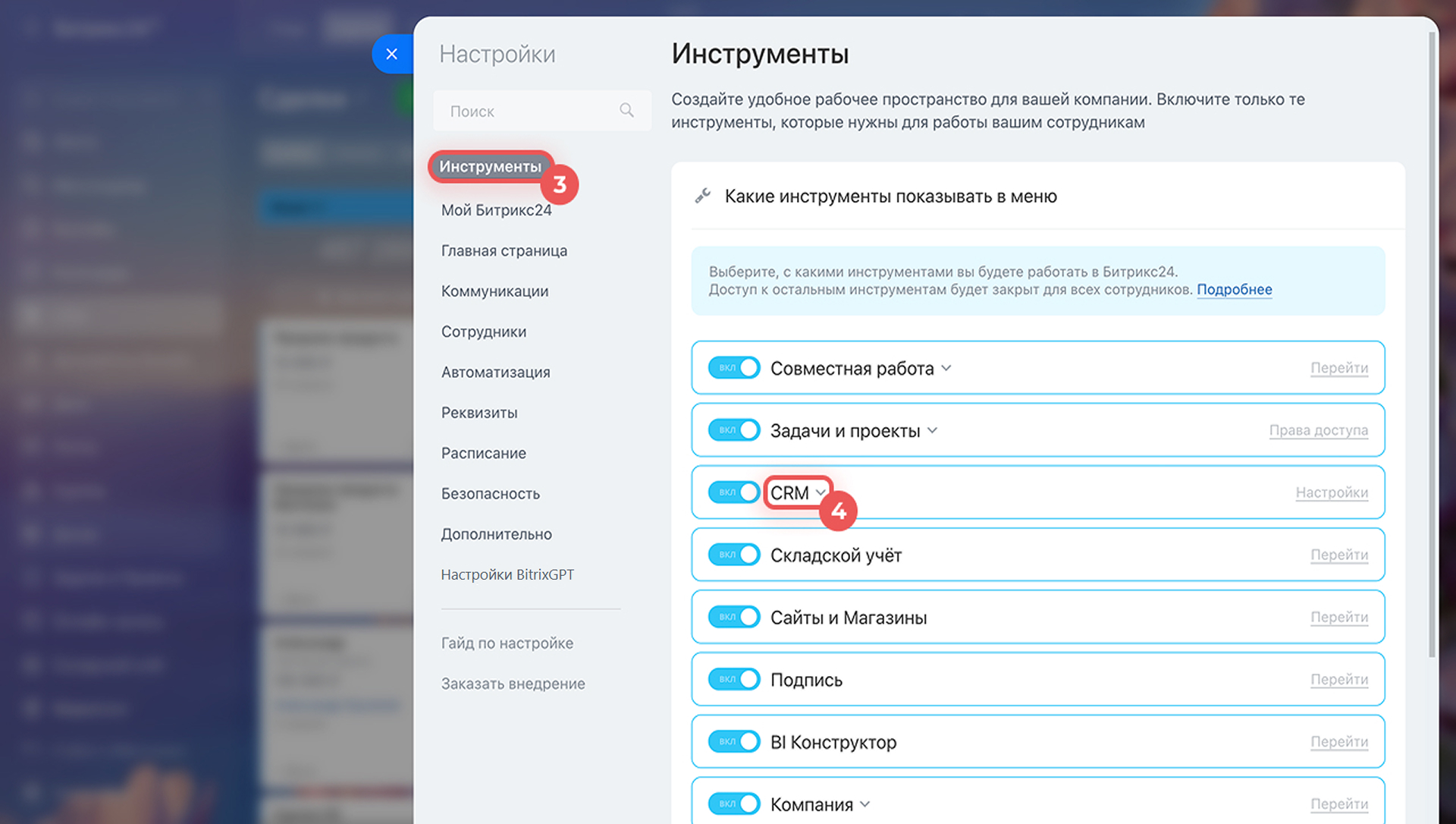1–4. Перейдите в CRM > Еще > Настройки > Права доступа к CRM.