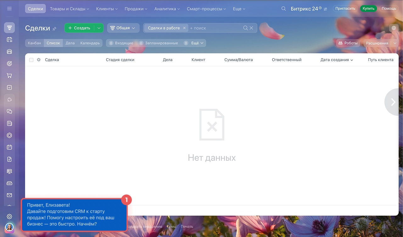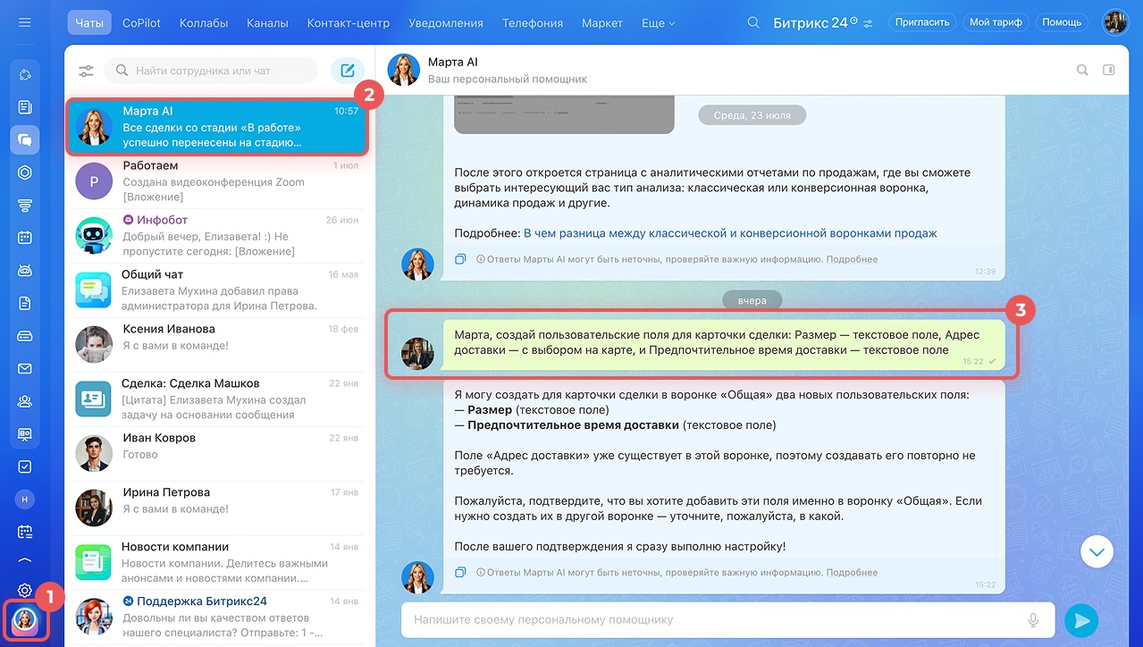 Если ваш Битрикс24 старше 30 дней, для настройки CRM напишите Марте AI в чат. Попросите ее создать новую воронку продаж или посоветовать, какие пользовательские поля можно добавить в карточку сделки.