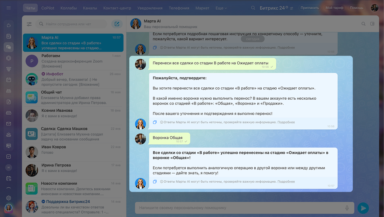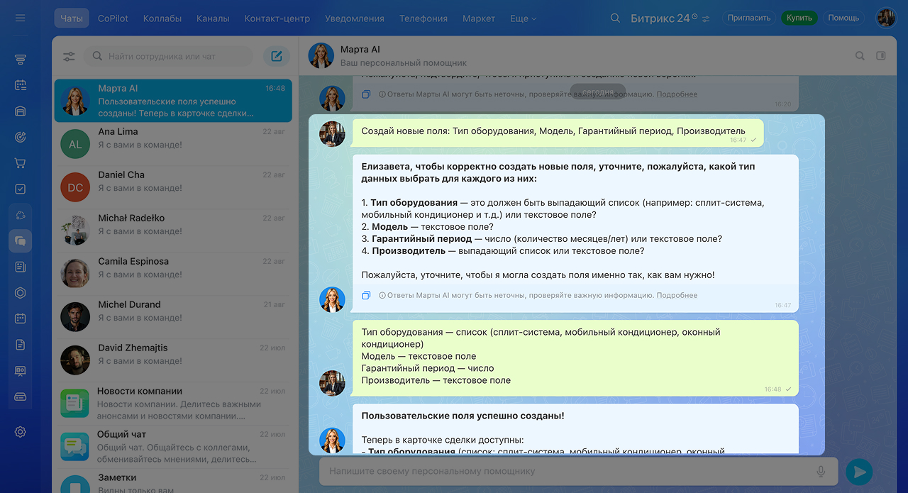 При настройке CRM Марта AI учитывает возможности тарифа, права пользователей и другую информацию о вашем Битрикс24. Например, она не создаст новую воронку, если это ограничено тарифом, и не добавит новые поля — если у сотрудника нет на это прав. В таких случаях Марта AI предложит обратиться к администратору CRM или Битрикс24.