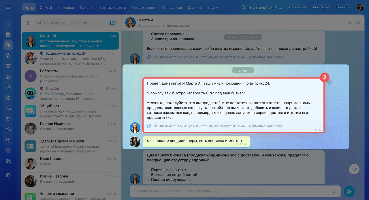 - Марта AI — ваш виртуальный помощник по Битрикс24 на базе искусственного интеллекта. Она настроит CRM под задачи вашего бизнеса: создаст воронки продаж, стадии и пользовательские поля.