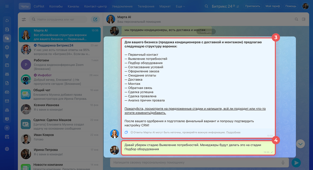 4. Напишите Марте AI, если нужно что-то добавить или изменить. Например, если в списке предложенных стадий есть лишние, попросите убрать их. Когда вы подтвердите, что варианты подходят, Марта AI приступит к настройке.