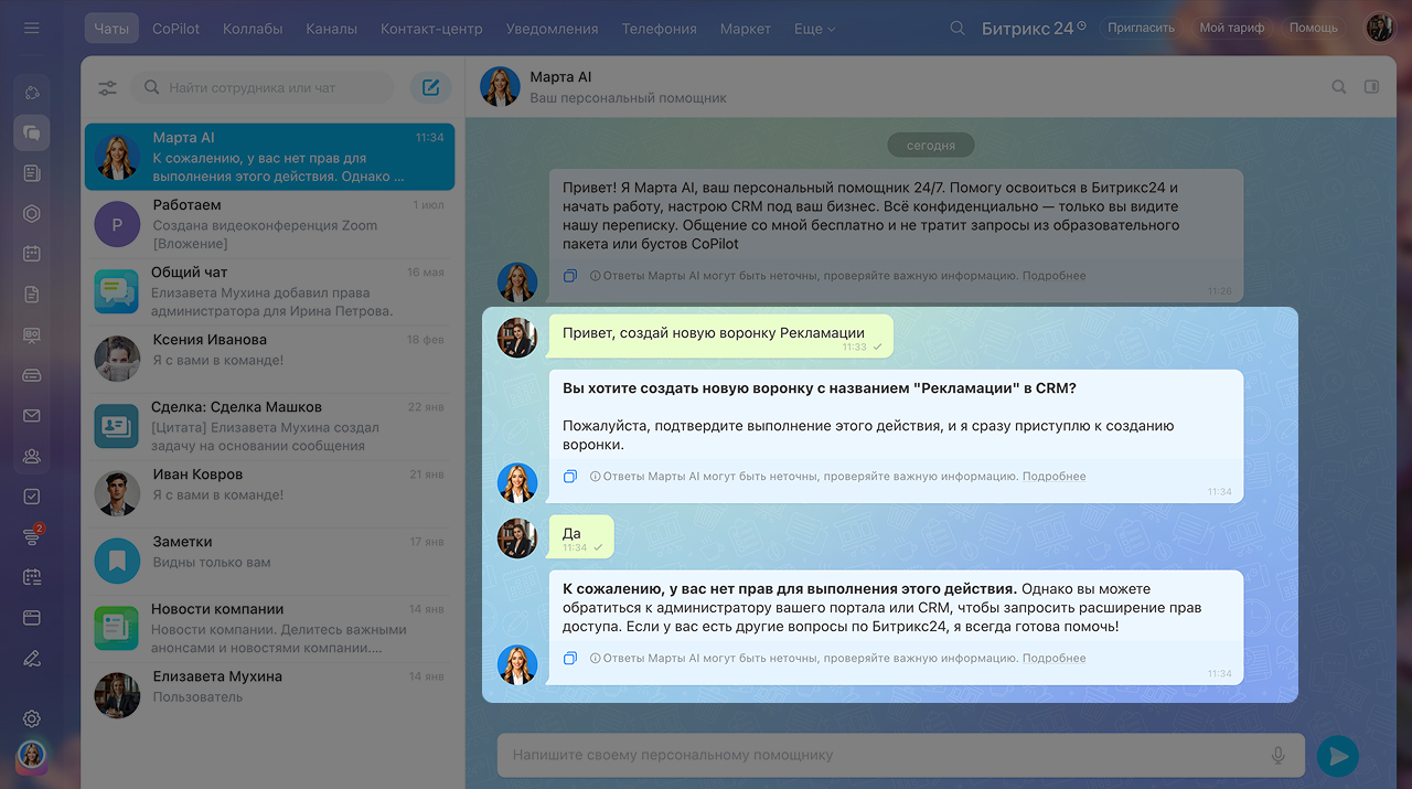 - При настройке CRM Марта AI учитывает возможности тарифа, права пользователей и другую информацию о вашем Битрикс24. Если прав недостаточно, предложит обратиться к администратору CRM или Битрикс24.