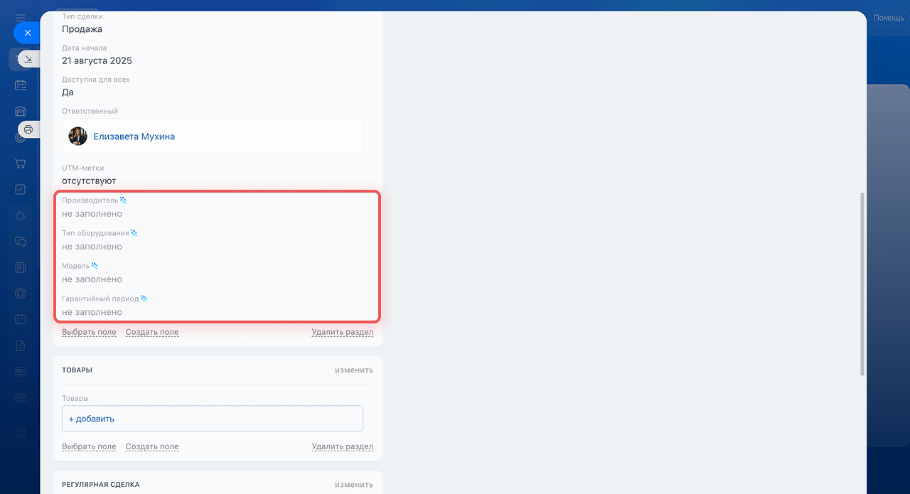- Добавить пользовательские поля: Тип оборудования, Модель, Гарантийный период, Производитель.
