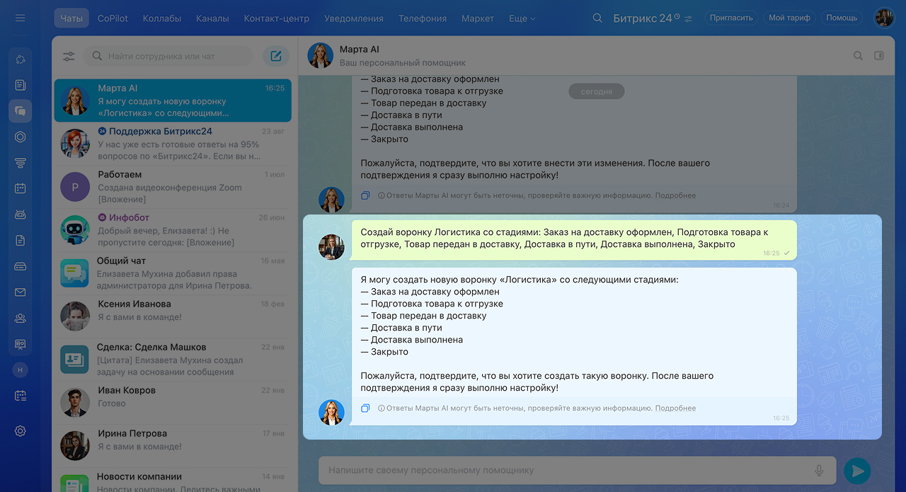 Воронки и стадии. Марта AI настраивает воронки и стадии на основе информации о вашем бизнесе. Если они уже настроены, можно попросить виртуального помощника дать рекомендации по улучшению или создать еще одну воронку. Например, настроить отдельную воронку для отдела логистики.