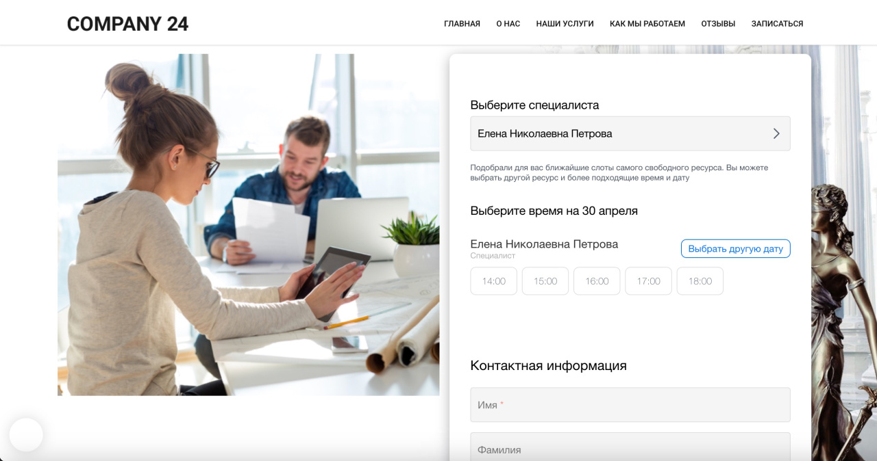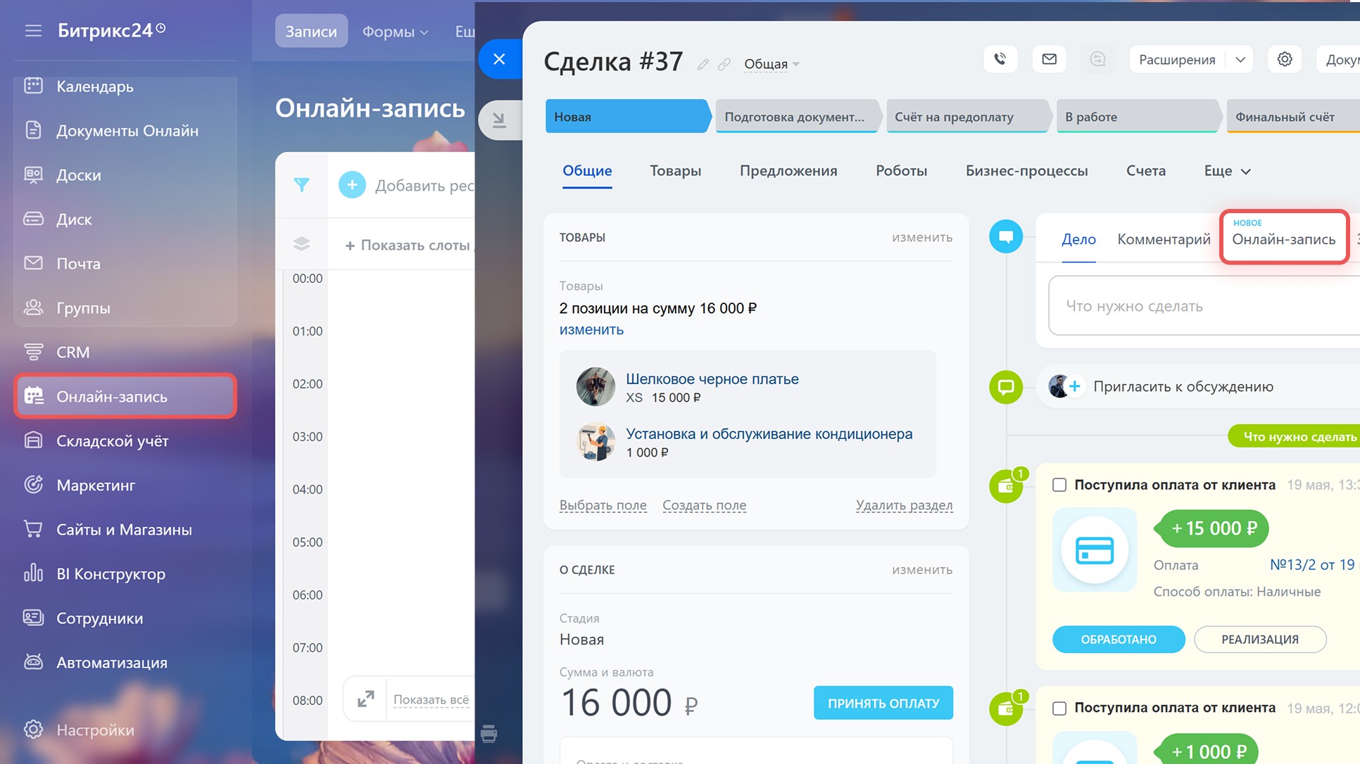 - Вместе с CRM. Основной сценарий — запись встроена в работу с клиентами. Например, компания по установке окон бронирует выезды мастеров, и каждая запись автоматически сохраняется в сделке.
