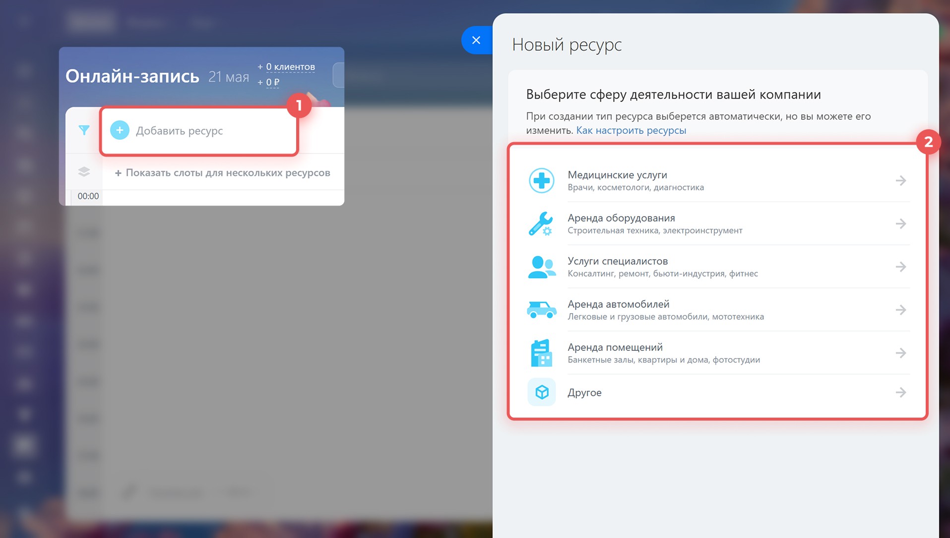 1. Добавить ресурсы для записи. Чтобы начать использовать онлайн-запись, нужно создать ресурсы. Это сотрудники, помещения или оборудование, которые клиенты будут бронировать. Например, в клинике это могут быть врачи и кабинеты, в учебном центре — преподаватели. Откройте раздел Онлайн-запись в карточке сделки или в боковом меню, нажмите Добавить ресурс и выберите сферу деятельности.