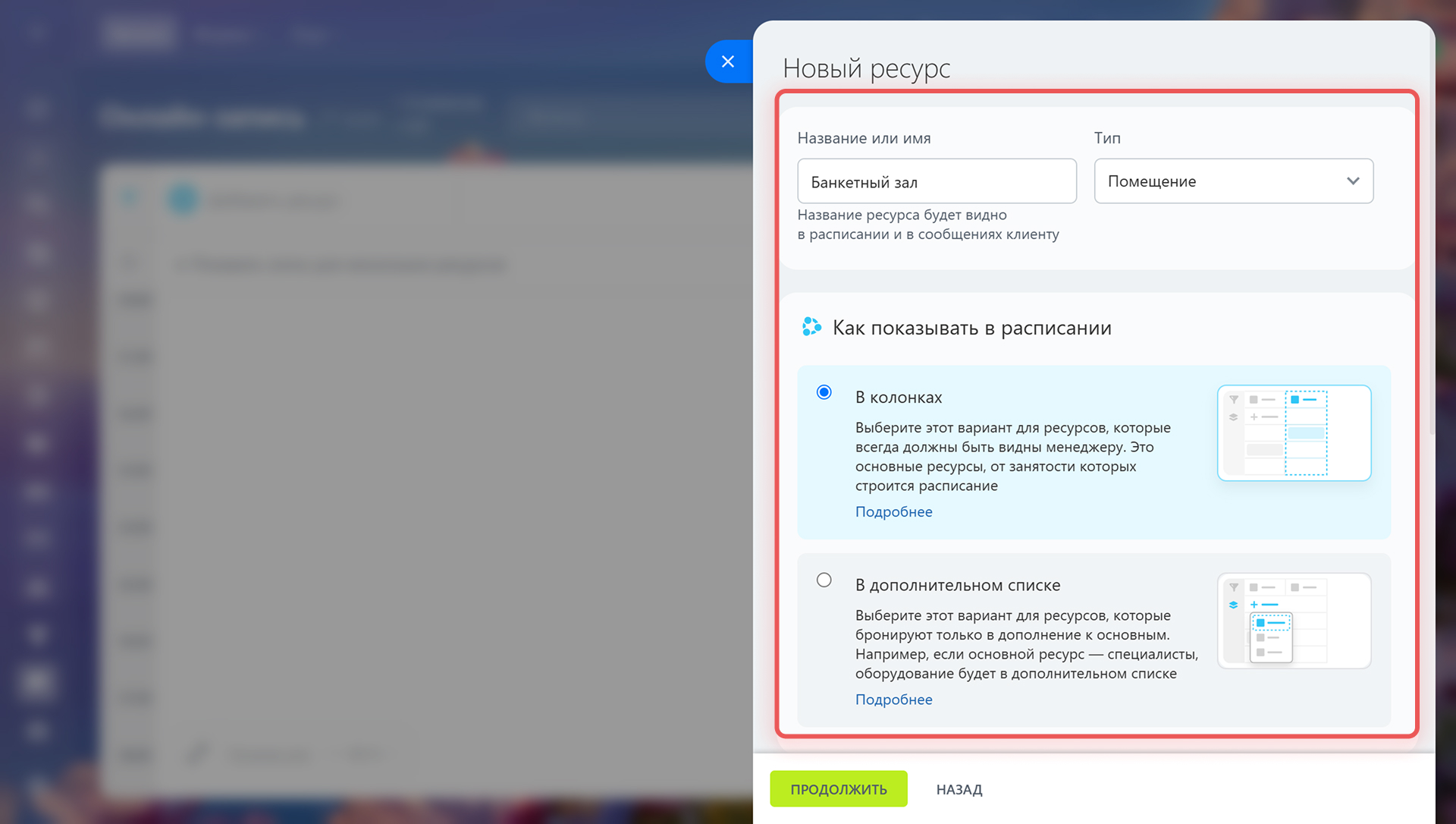 - В колонках — для ключевых ресурсов, от которых зависит запись: специалист, кабинет, зал. По ним строится календарь, и они всегда видны менеджеру. Используйте этот вариант, если запись невозможна без этого ресурса.