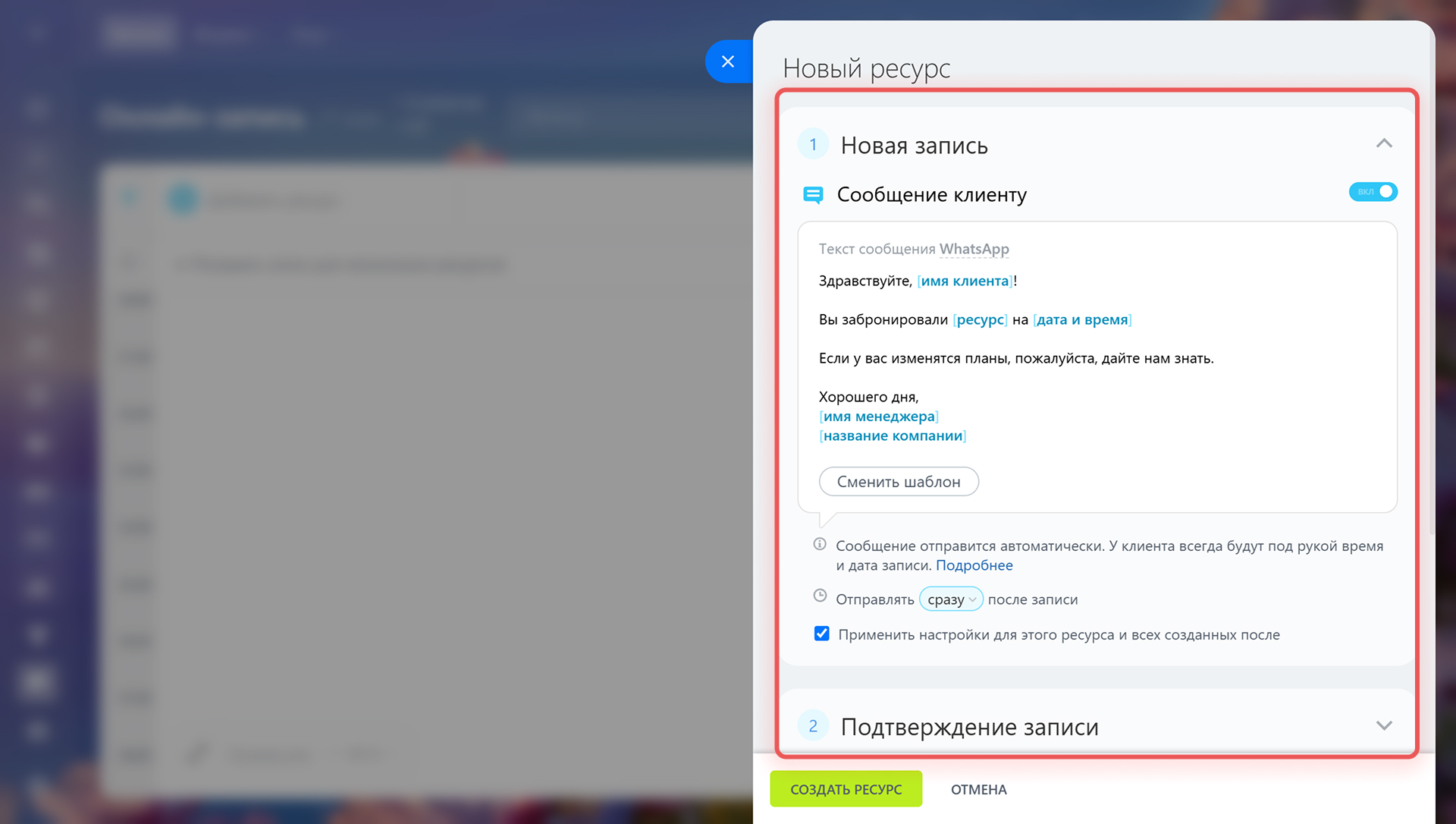 - Новая запись. CRM отправляет клиенту сообщение с датой, временем, названием услуги и ресурсом. По умолчанию оно уходит сразу после записи, но можно изменить время — например, через 10 минут или через час. Подходит для всех видов услуг — чтобы клиент сразу получил подтверждение и понимал, что запись прошла успешно.