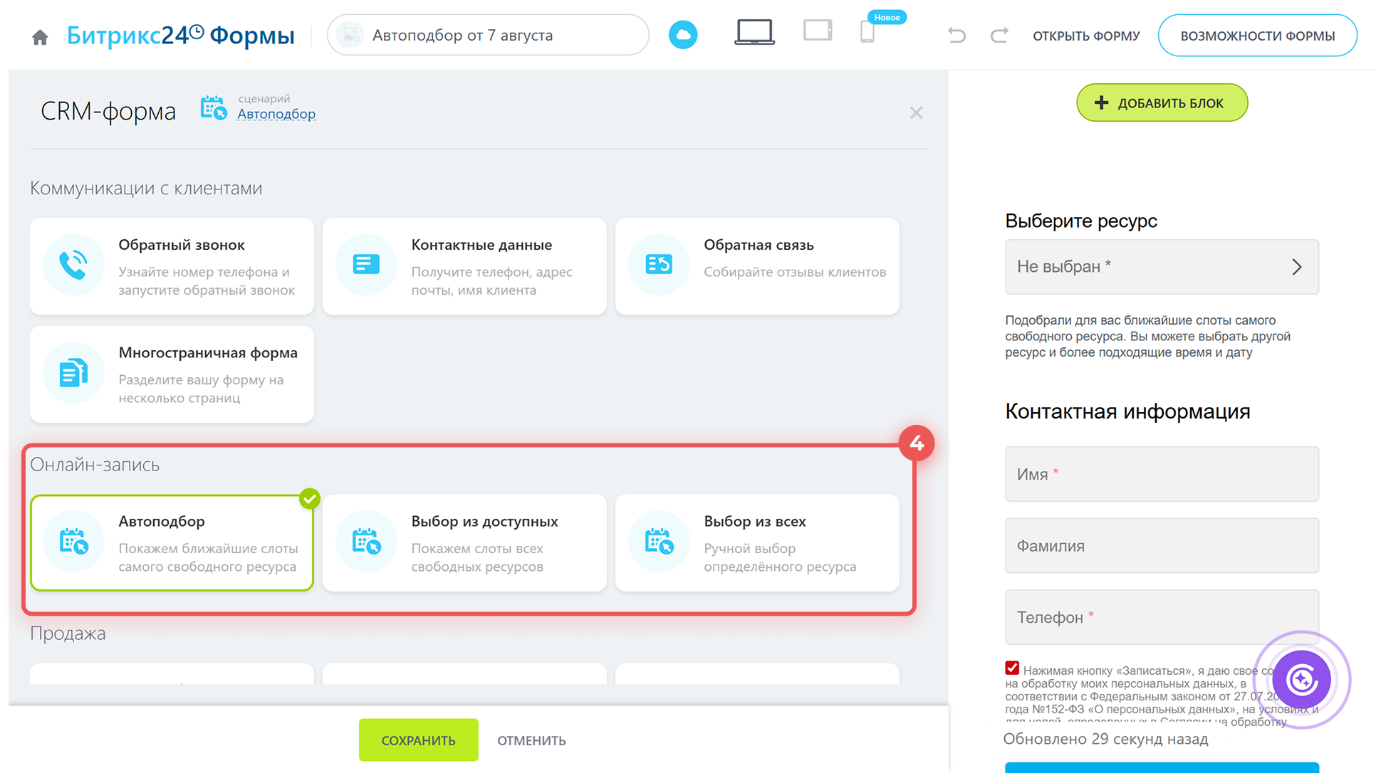 - Автоподбор — Битрикс24 предлагает ближайшее свободное время и подходящего специалиста. Подходит, если клиенту важно записаться быстрее, а выбор конкретного сотрудника не принципиален.