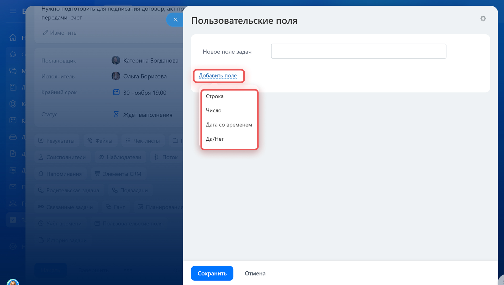 В карточке задачи нажмите Пользовательские поля > Добавить поле и выберите тип создаваемого поля: