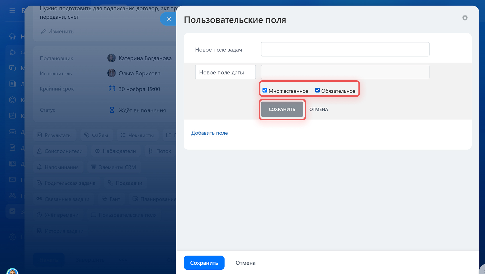Вы можете создать обязательное и множественное поле. Отметьте нужные параметры и нажмите Сохранить.