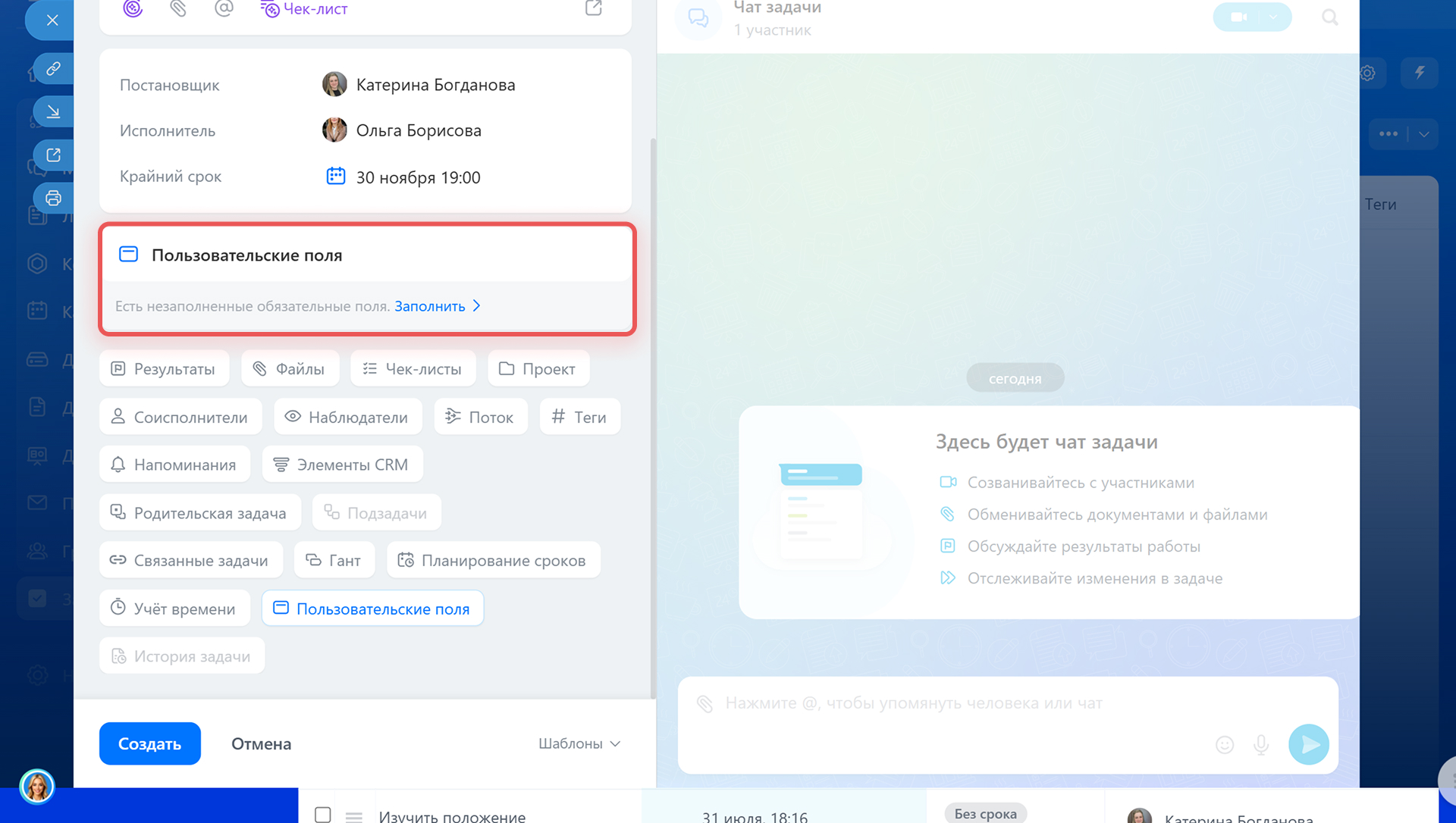 Если сотрудник не заполнит обязательное поле и попытается создать задачу, то появится ошибка.