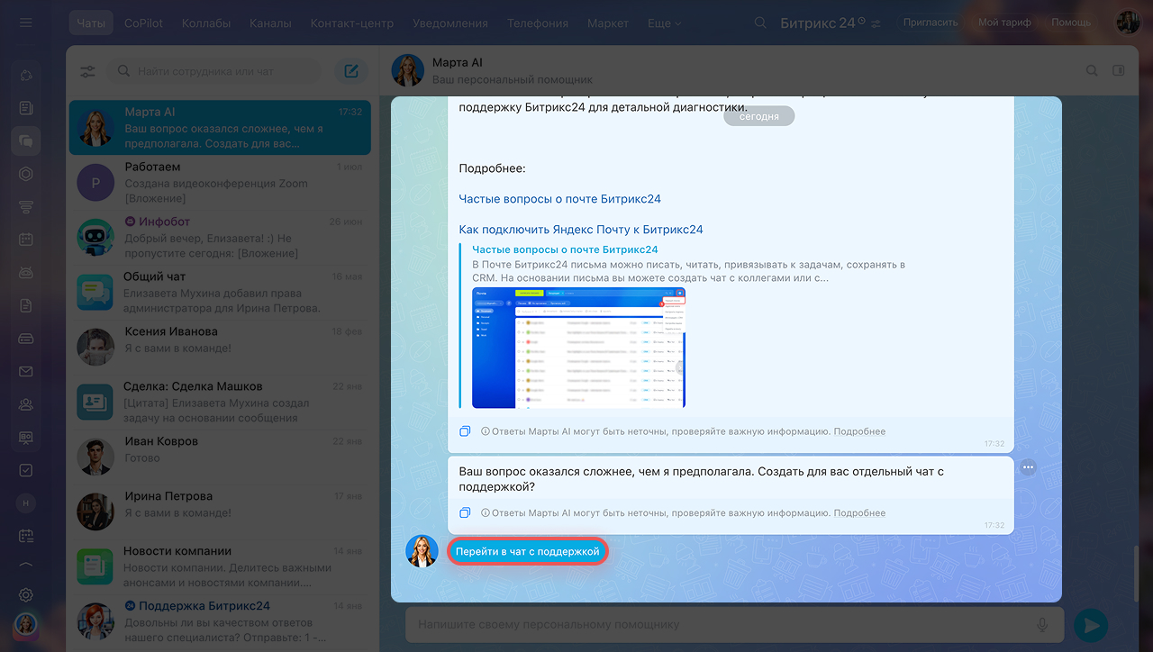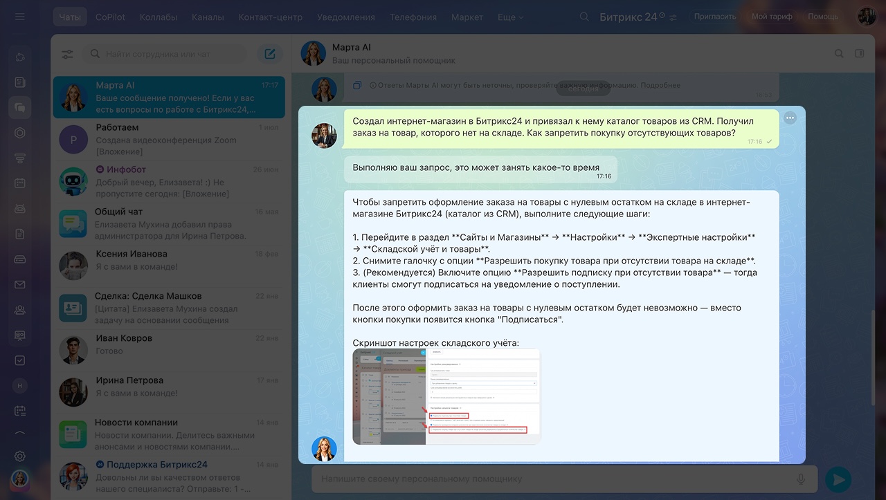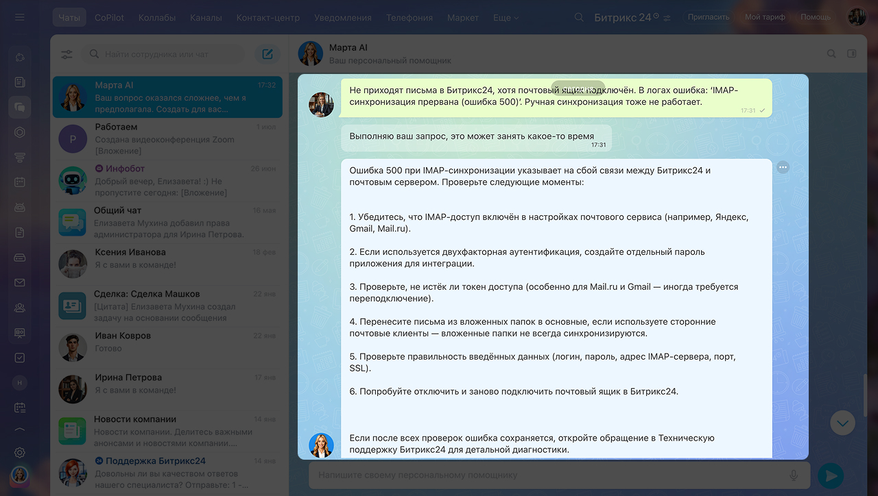 Марта AI — ваш виртуальный помощник в Битрикс24. Чтобы ответить на вопросы, она анализирует данные вашего Битрикс24 и внутренней базы знаний. Иногда ее ответы могут быть неточными по нескольким причинам: