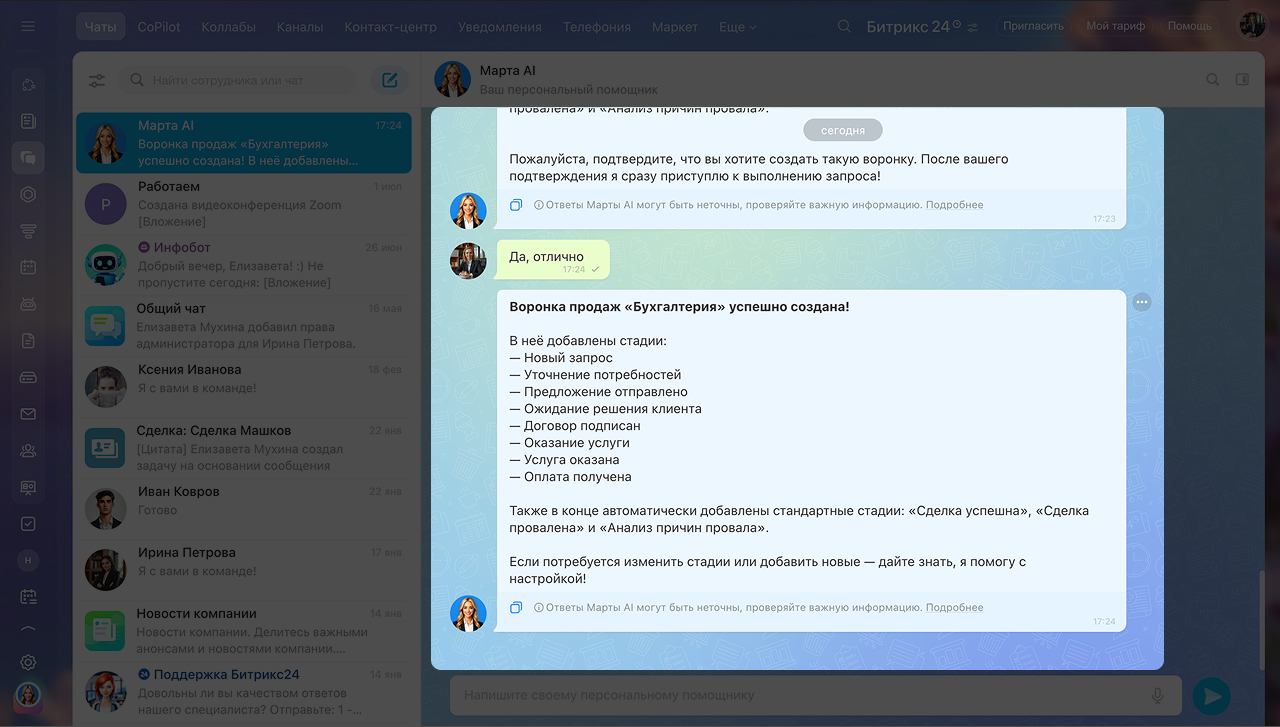 Марта AI сумеет настроить воронку продаж, но не сможет проверить, какие дела запланированы конкретным сотрудником. Мы постепенно расширяем ее возможности.