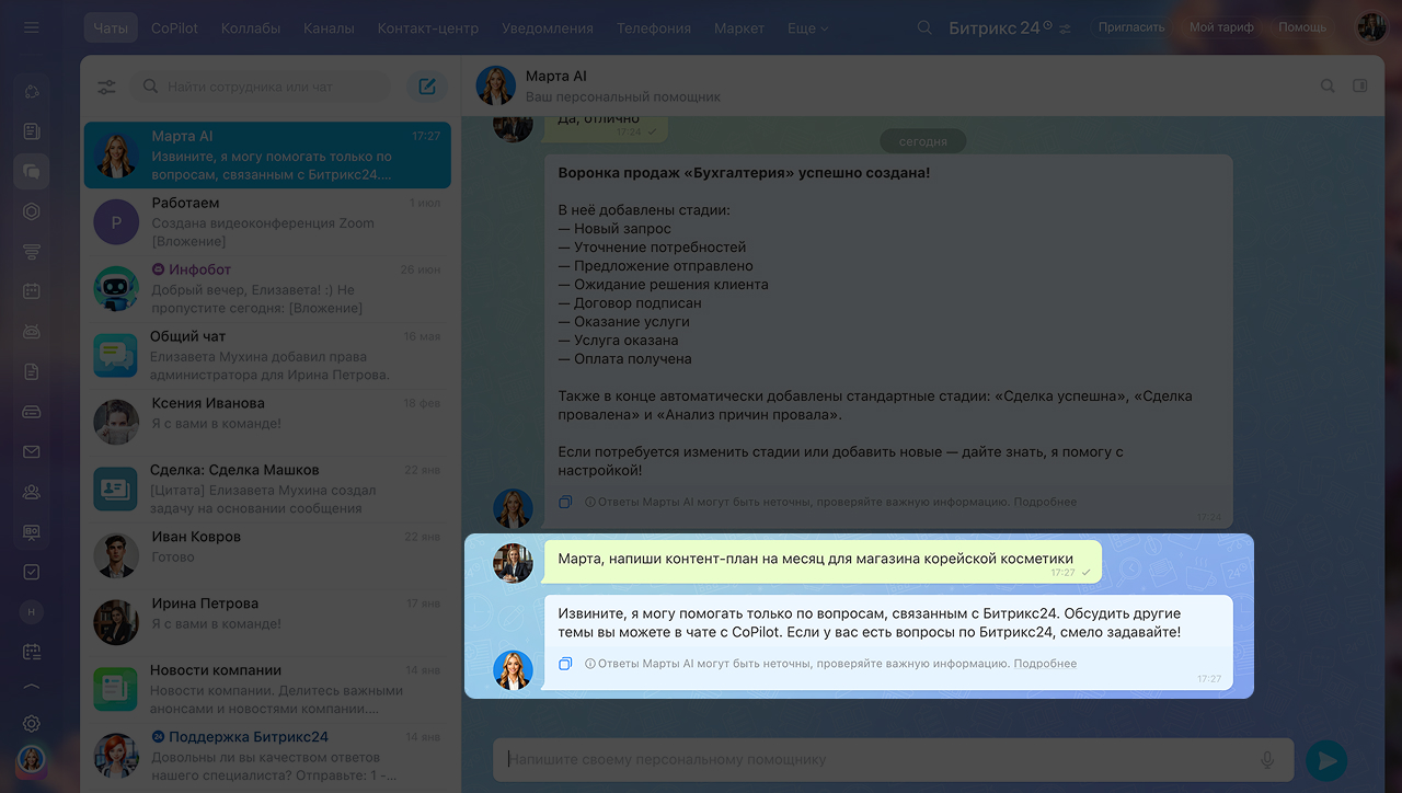Марта AI отвечает только на вопросы о работе Битрикс24. Если вы