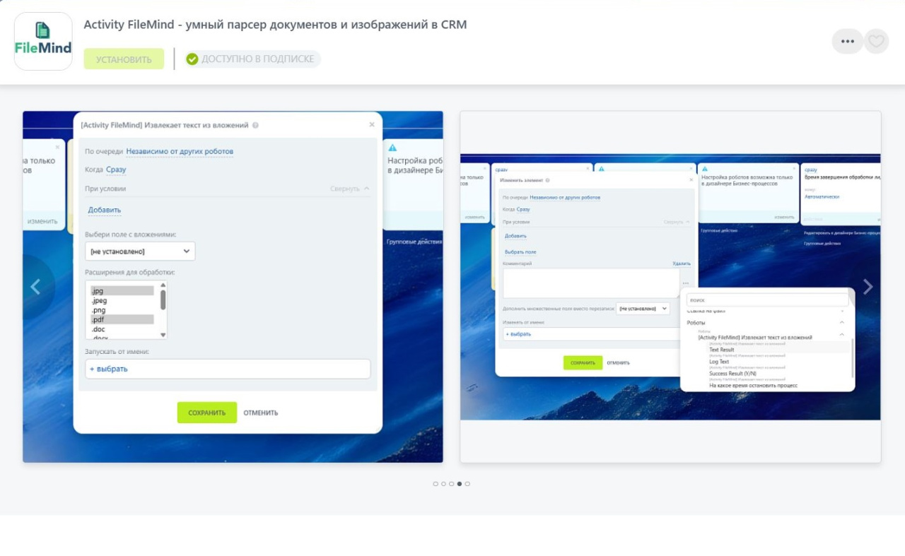 Activity FileMind – робот и действие для бизнес-процессов, которое парсит разные типы документов, включая Word и Excel (pdf, doc, docx, xls, xlsx, csv, txt, html) и изображения (jpg, jpeg, png) в Лидах, Сделках и Смарт-процессах.