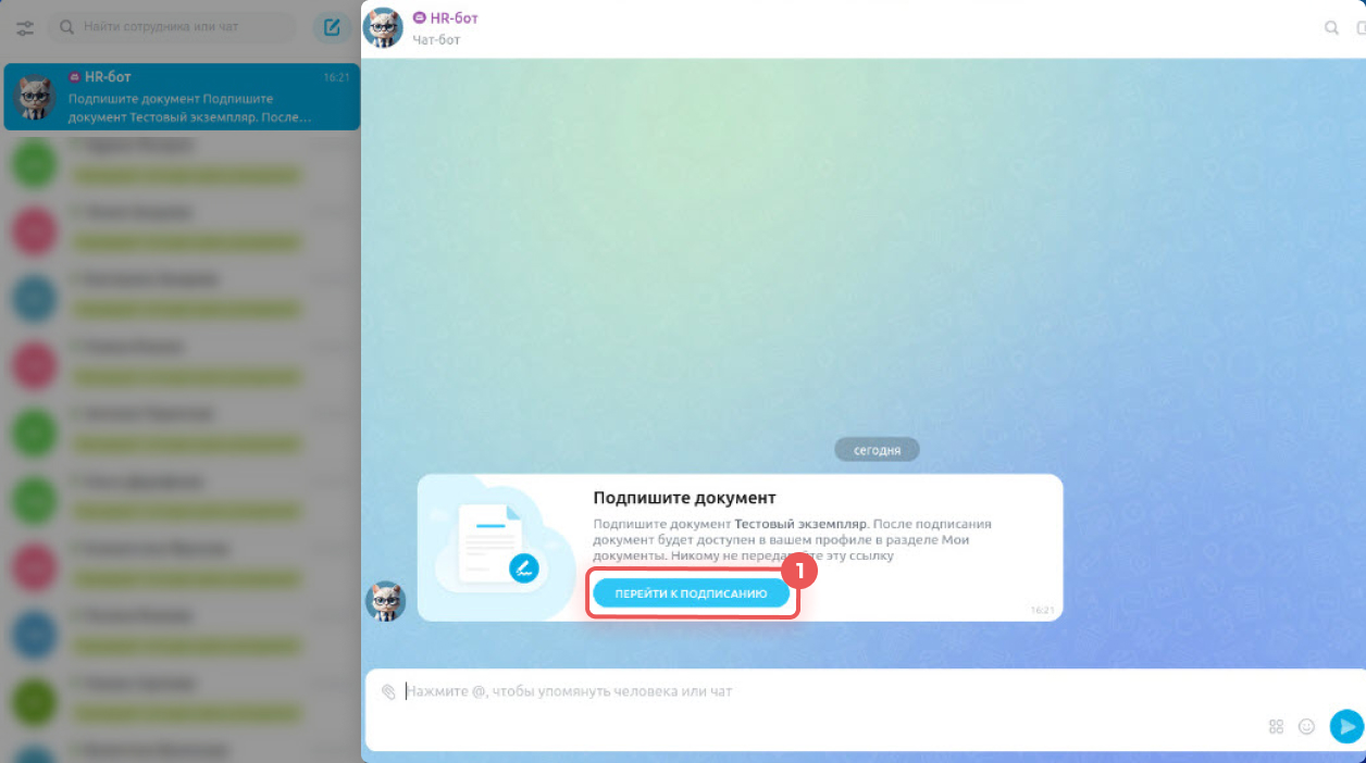 - Нажмите Перейти к подписанию в сообщении от HR-бота.
