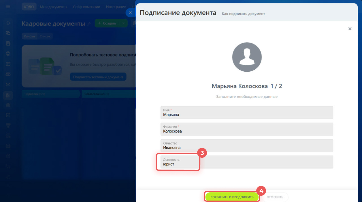 Запустить процесс может сотрудник с правами доступа к Битрикс24 КЭДО, например менеджер по персоналу. Он будет подписывать тестовый документ за обе стороны — и за представителя компании, и за сотрудника.