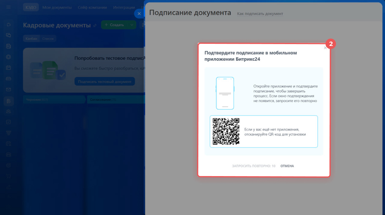 - Подтвердите подписание документа в мобильном приложении Битрикс24. Если его нет — наведите камеру смартфона на QR-код, чтобы скачать приложение.