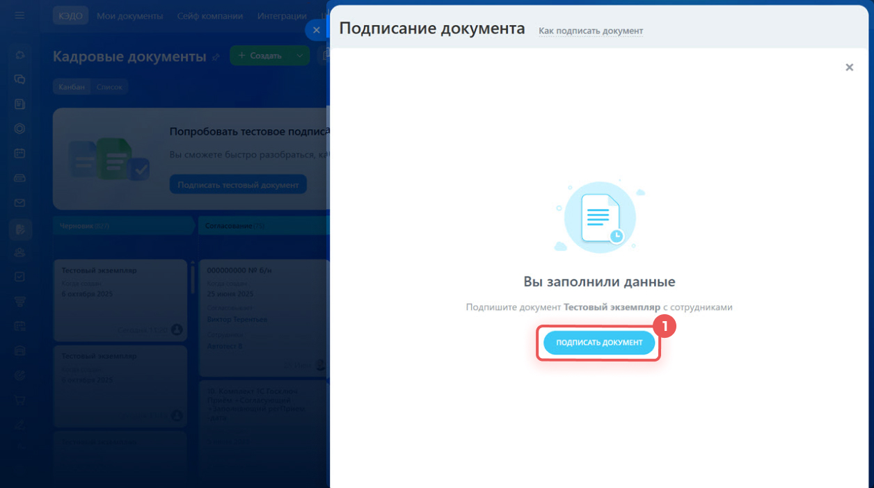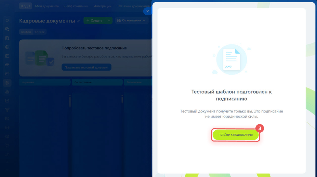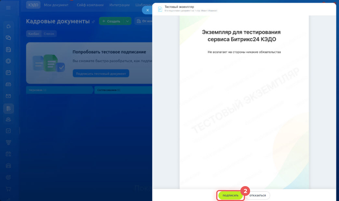 Тестовое подписание доступно, если в Битрикс24 КЭДО нет ни одного подписанного документа.