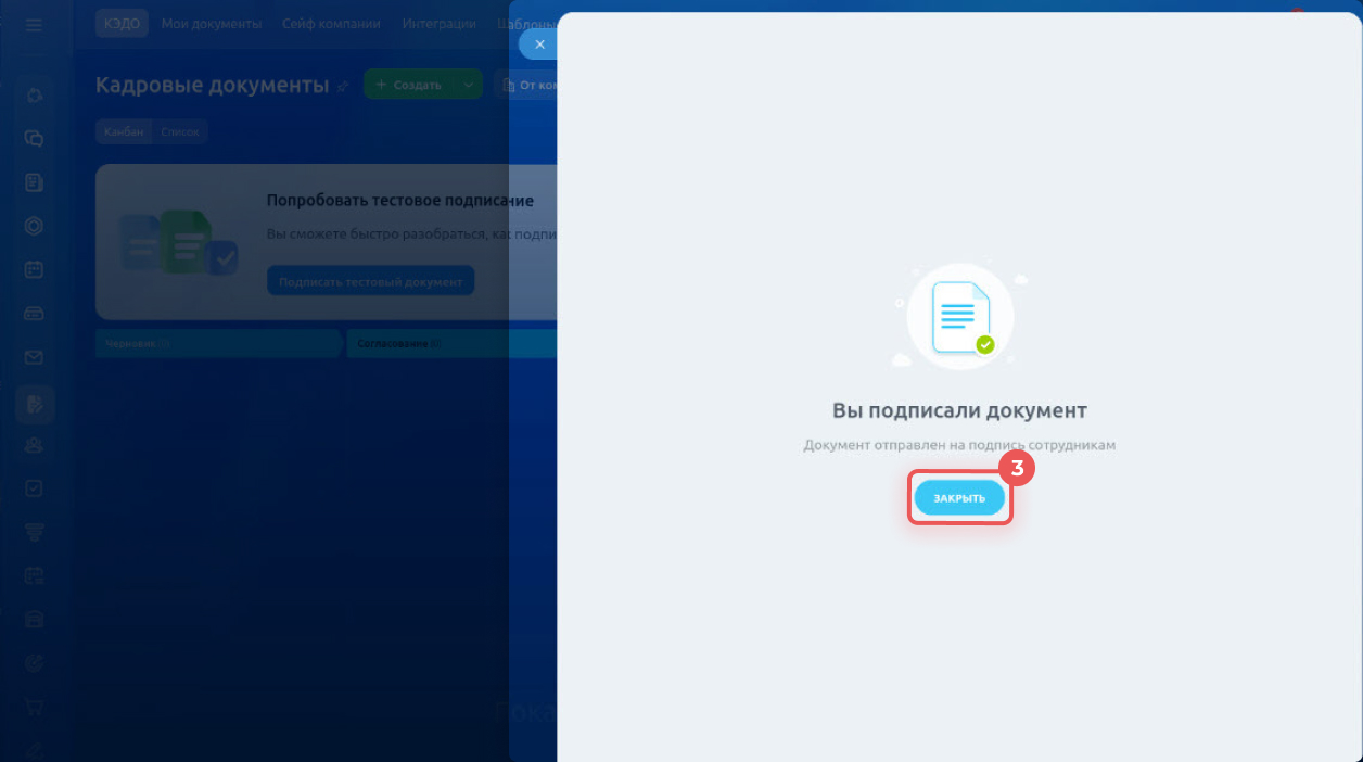 - Нажмите Закрыть. После этого документ будет отправлен на подпись сотрудникам.