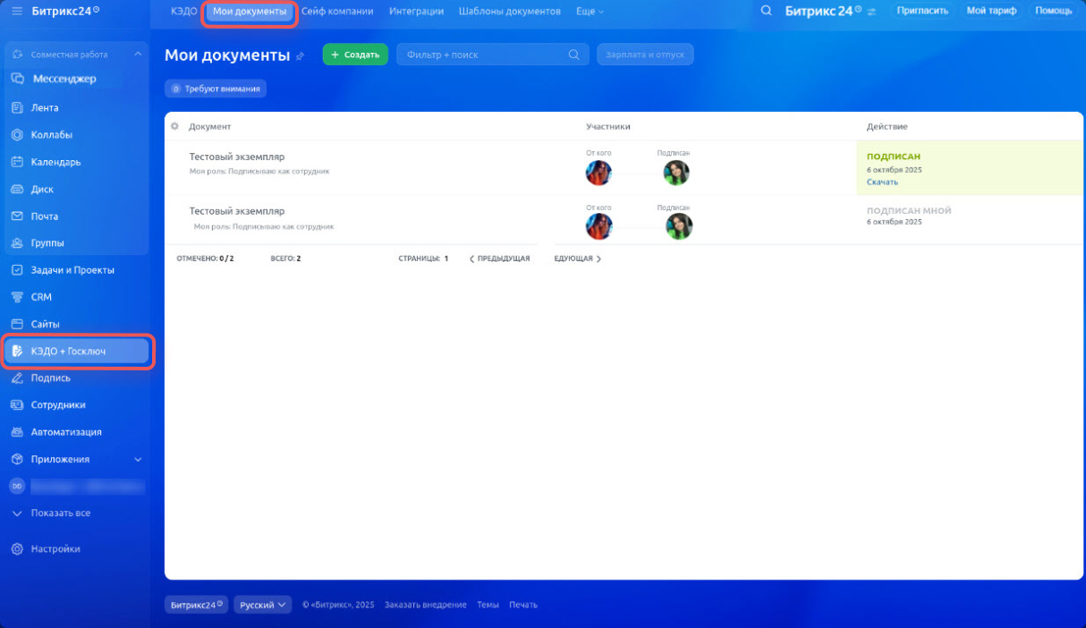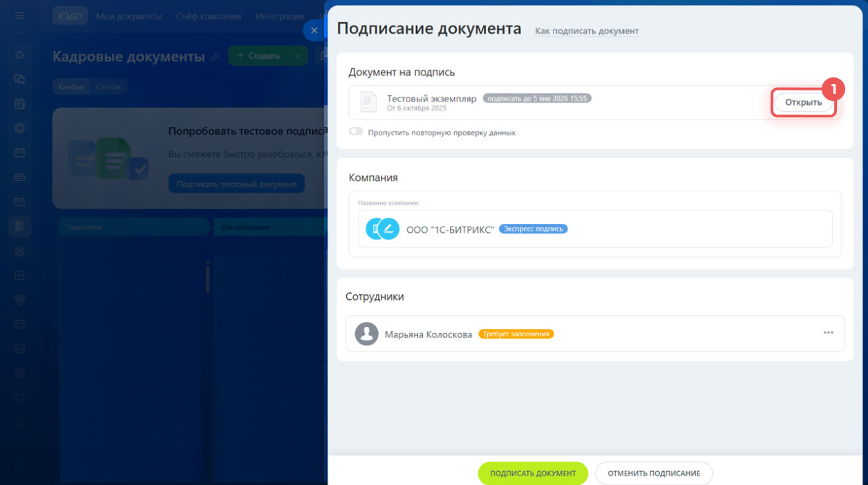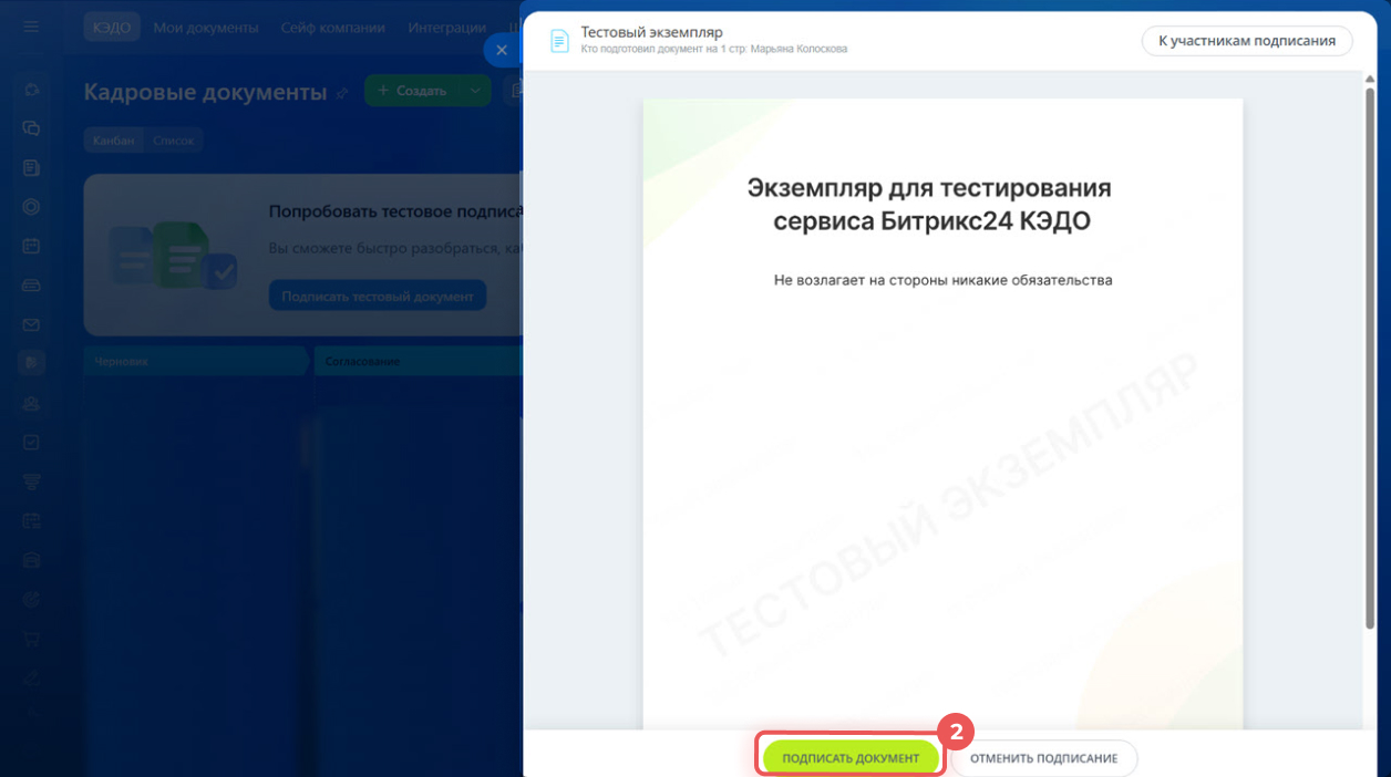 - Тестовое подписание доступно, если в Битрикс24 КЭДО нет ни одного подписанного документа.