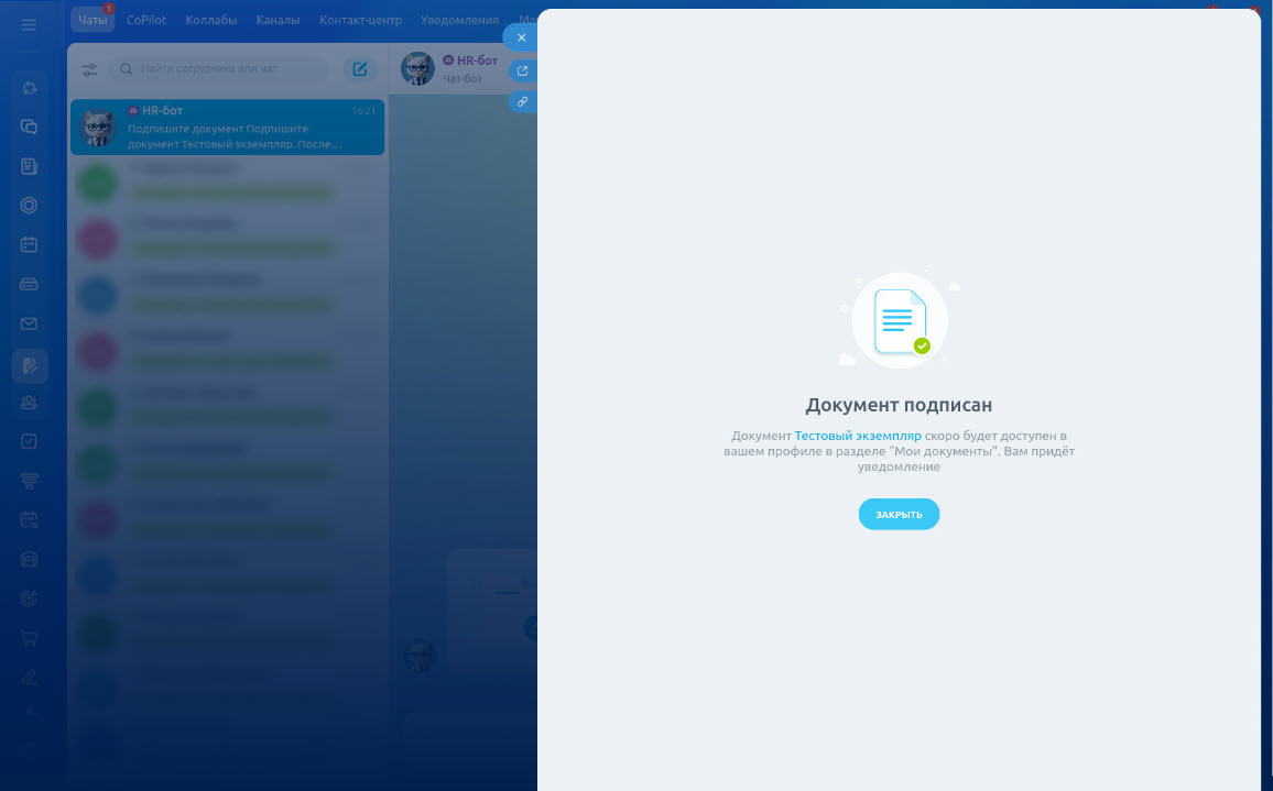 Подписать за сотрудника. Когда вы подпишете документ за представителя компании, в чат придет уведомление от HR-бота. Теперь нужно подписать документ за сотрудника.