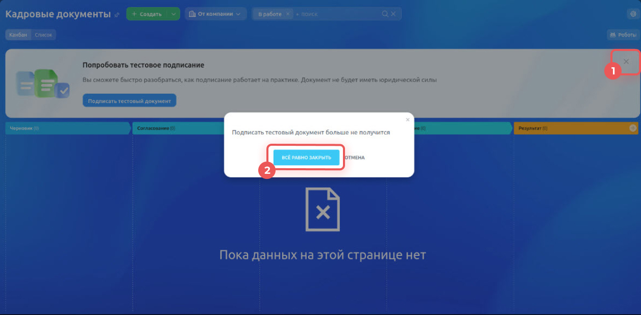 - Если вы уже проверили, как подписание работает на практике, тестовый режим можно отключить. Нажмите на крестик на баннере и выберите Все равно закрыть.