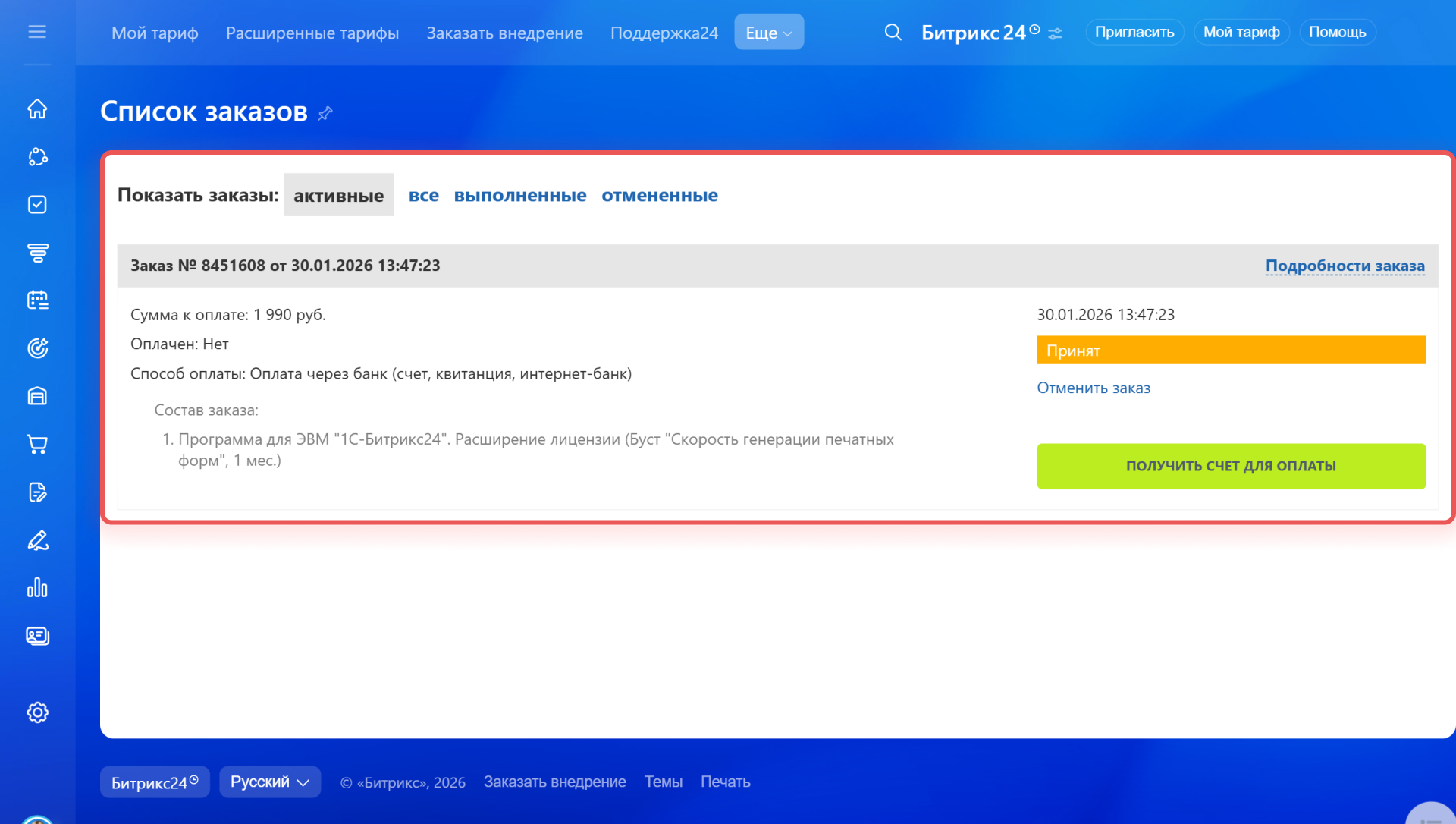 Купить буст можно у официальных партнеров Битрикс24 или самостоятельно через виджет Мой тариф. В одном заказе можно оформить несколько бустов одного вида. Например, три буста скорости генерации документов CRM.