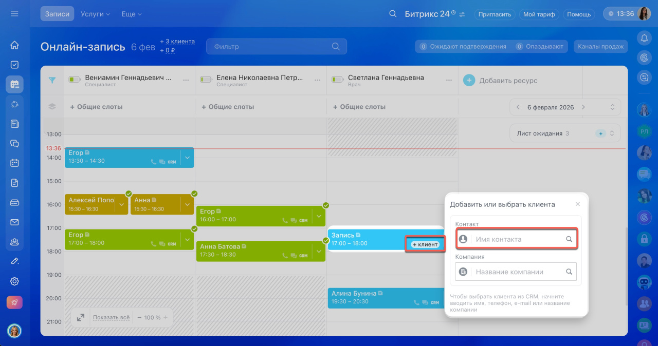 В разделе Онлайн-запись. При создании новой записи нажмите Клиент. В поле Имя контакта начните вводить имя клиента и выберите его из списка. Запись автоматически свяжется с CRM и отобразится в карточке.