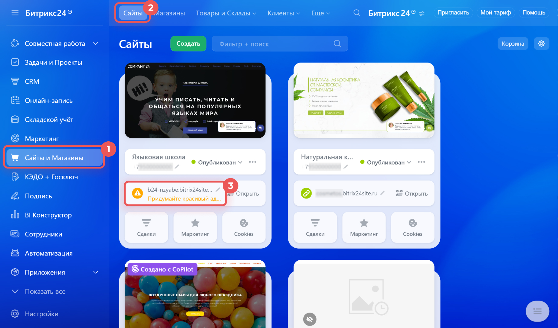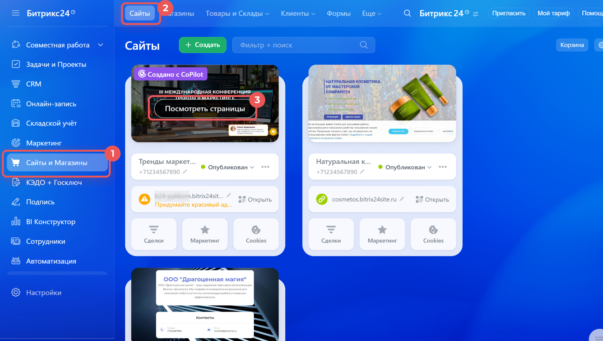 1–2. Перейдите в раздел Сайты и Магазины > Сайты.