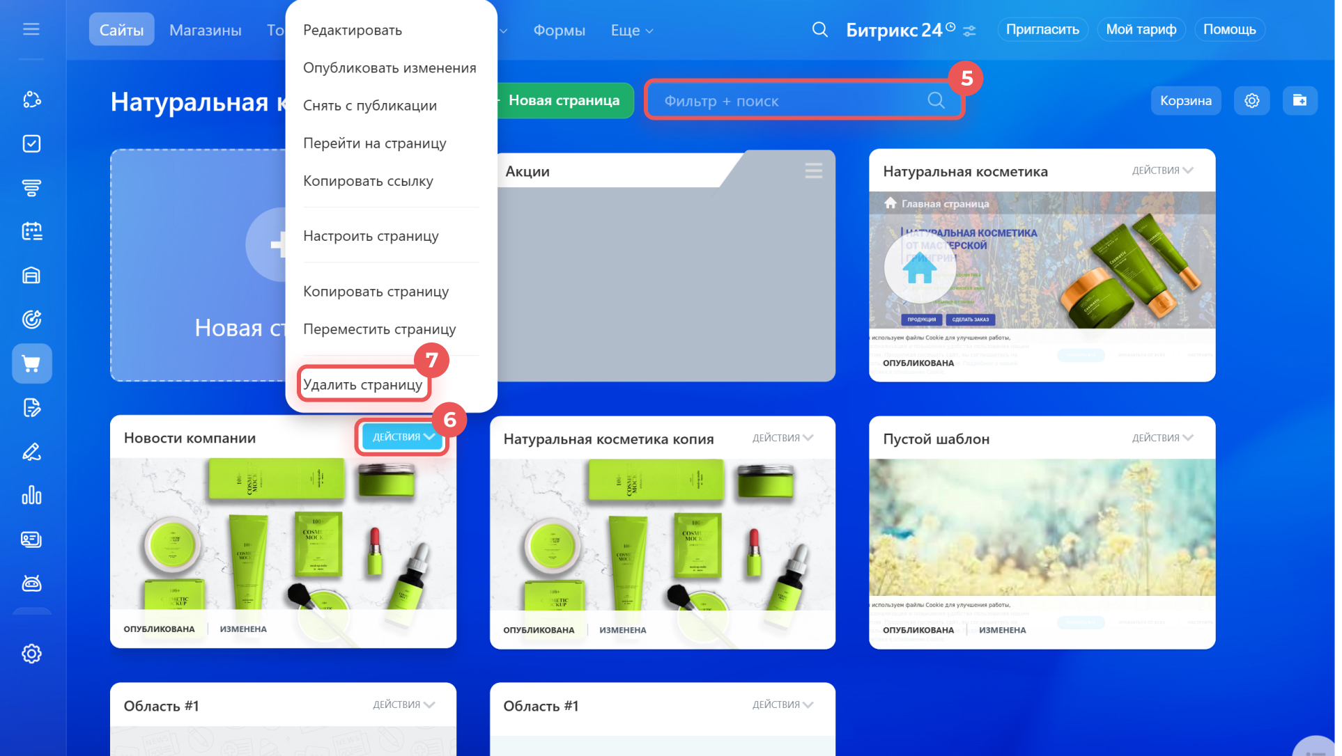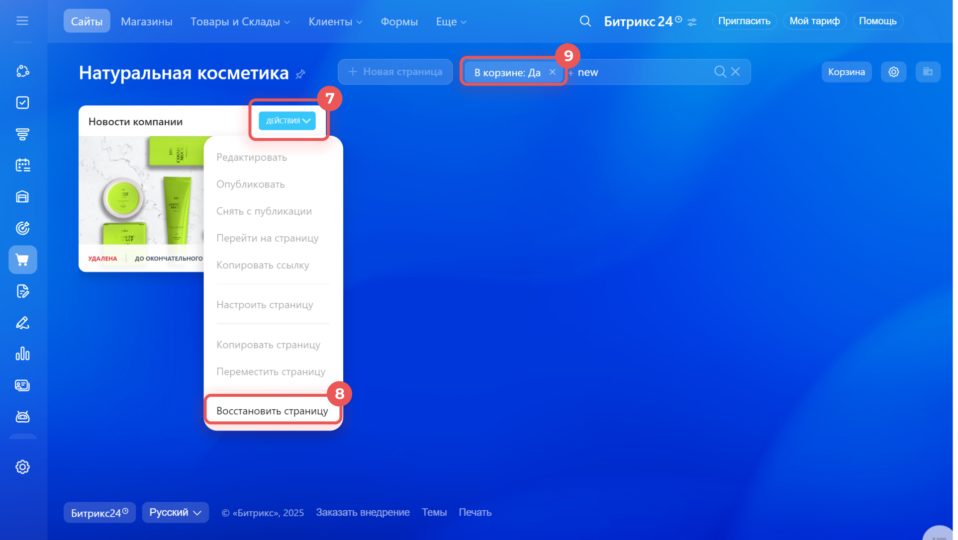 6–7. Найдите восстановленную страницу и нажмите Действия > Удалить страницу — она вернется в корзину.