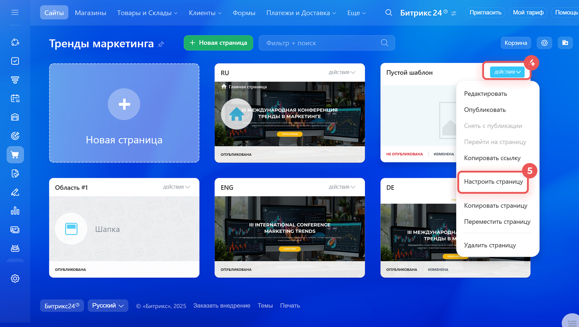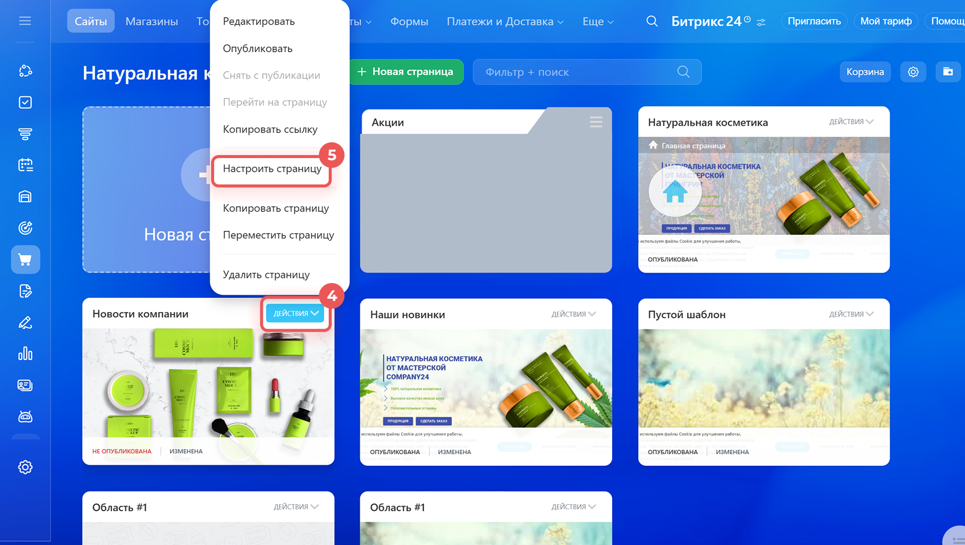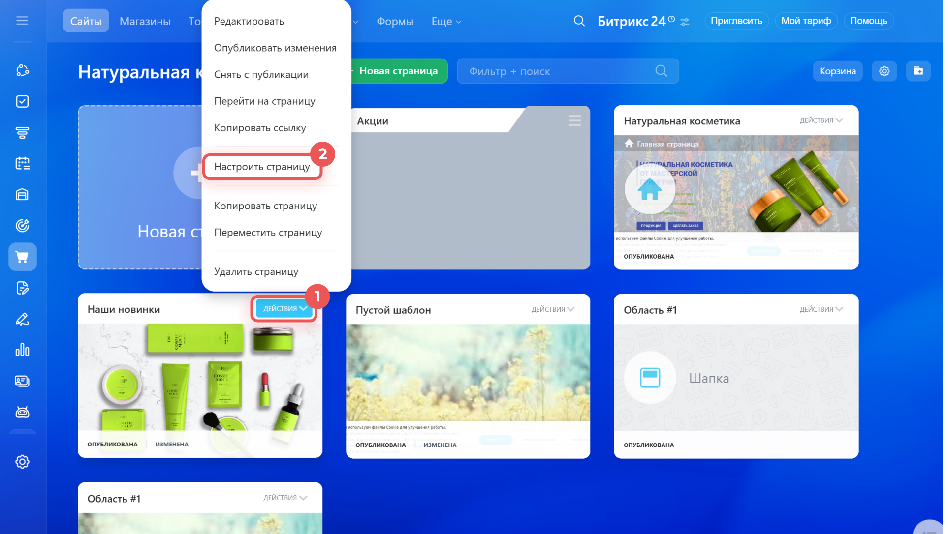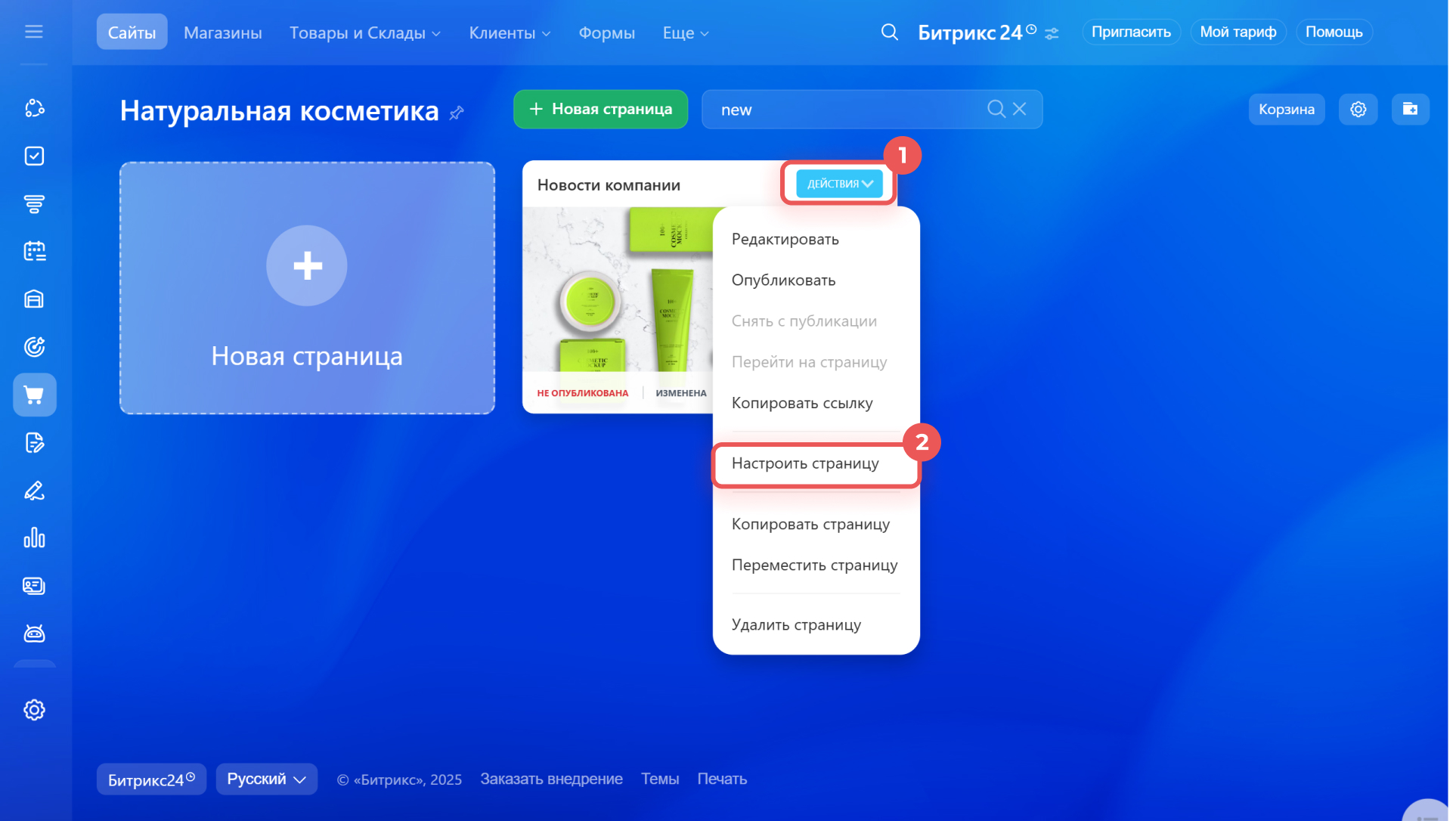 1–2. Найдите ее в списке страниц и нажмите Действия > Настроить страницу.