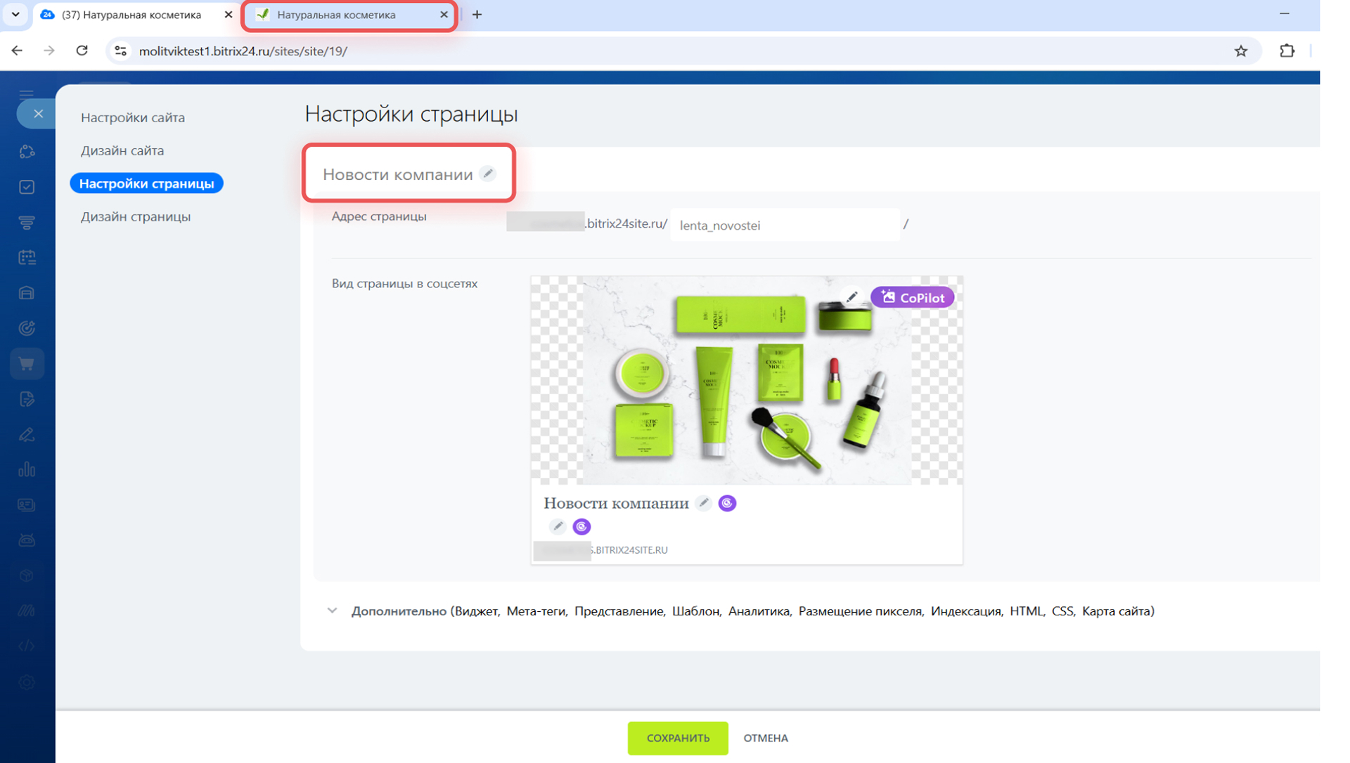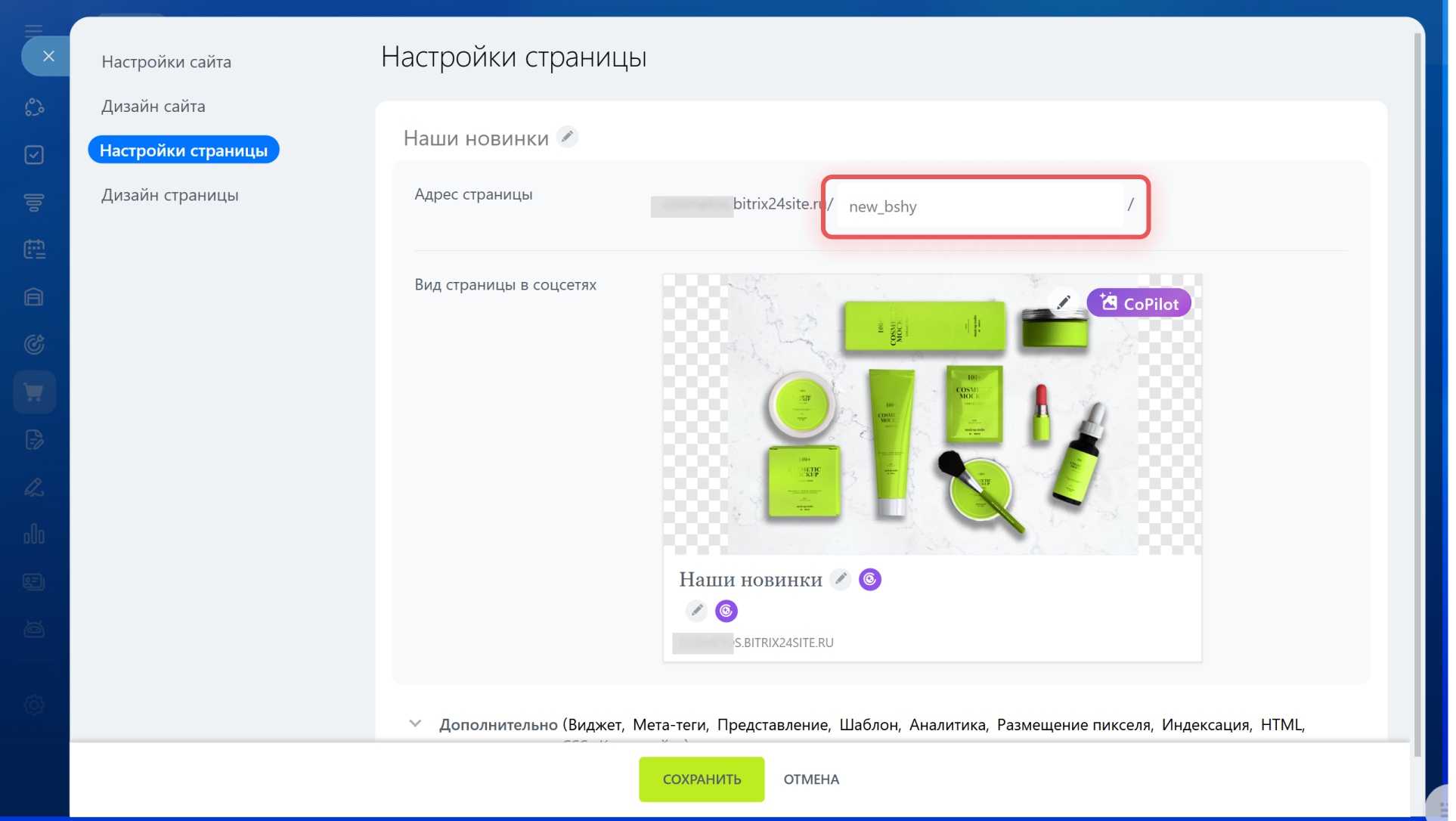 1–4. Нажмите Действия > Настроить страницу. Укажите новый URL и сохраните изменения.