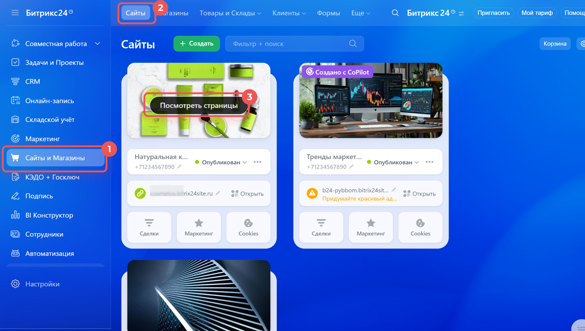 1–3. Перейдите в Сайты и Магазины > Сайты. Наведите курсор на сайт и нажмите Посмотреть страницы.