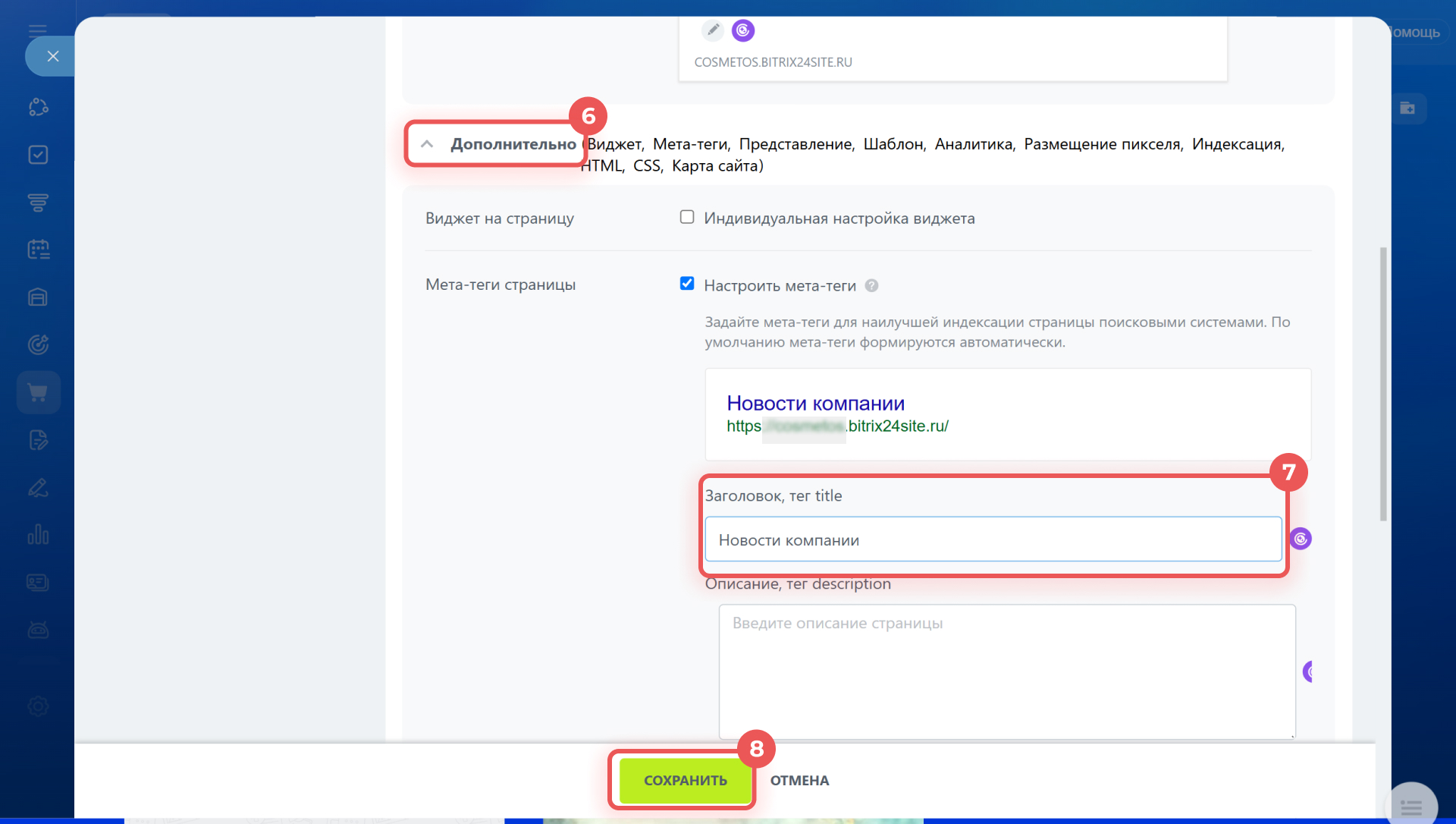7–8. В разделе Мета-теги страницы укажите нужный заголовок и сохраните изменения. Заголовок страницы