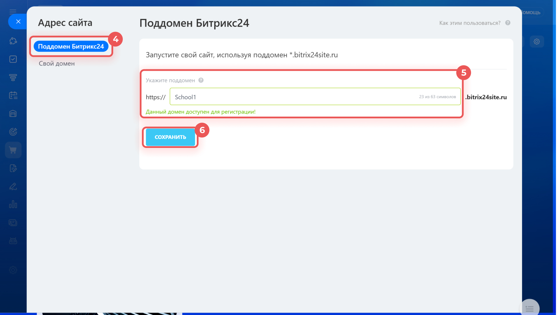 4–5. На вкладке Поддомен Битрикс24 введите подходящий поддомен. Проверьте, что он свободен для регистрации.