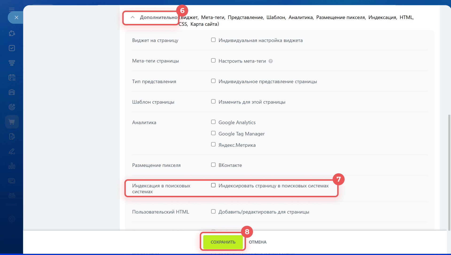 7. Снимите галочку с опции Индексировать страницу в поисковых системах, чтобы скрыть страницу от поисковиков. Чтобы вернуть страницу в выдачу, вновь поставьте галочку.