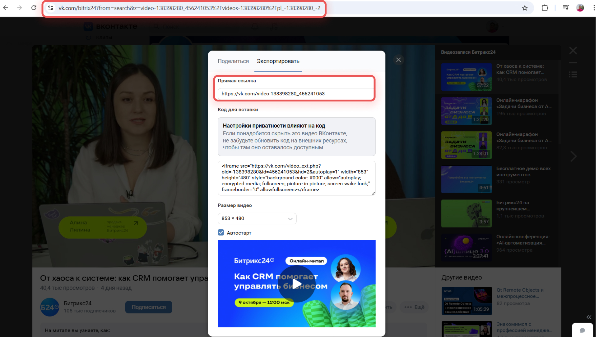 На сайт можно добавлять видео из VK без предварительной загрузки — ролики воспроизводятся напрямую по ссылке. Если видео не открывается, значит, у Битрикс24 нет к нему доступа.