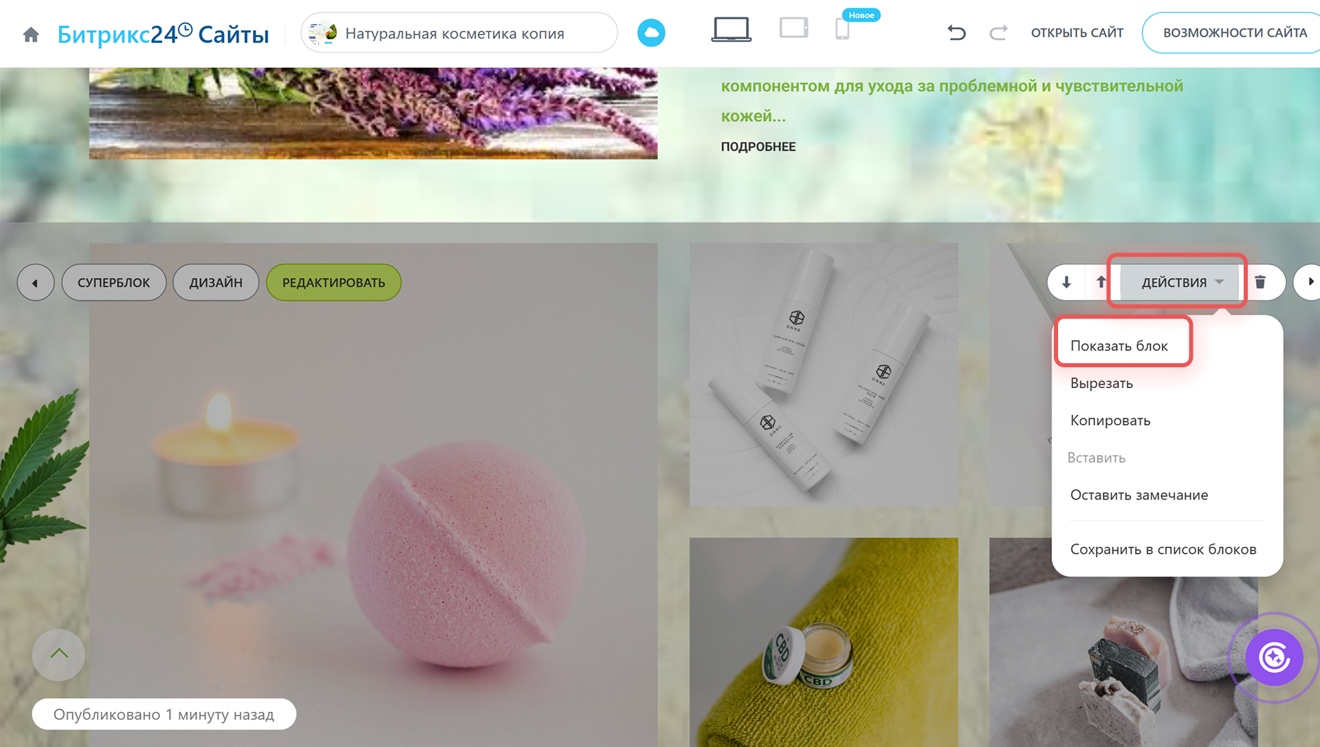 Скрытые блоки отмечены серым цветом и недоступны для редактирования и настройки дизайна. Чтобы вернуть блок на сайт, нажмите Действия > Показать блок.