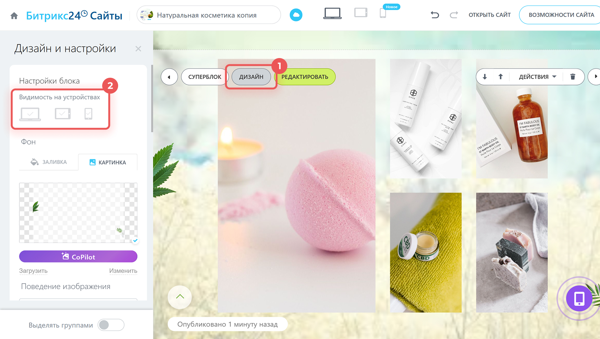 Если блок активен, но отображается не на всех устройствах, настройте его видимость. Нажмите Дизайн и отметьте галочкой устройства, на которых его нужно показать.