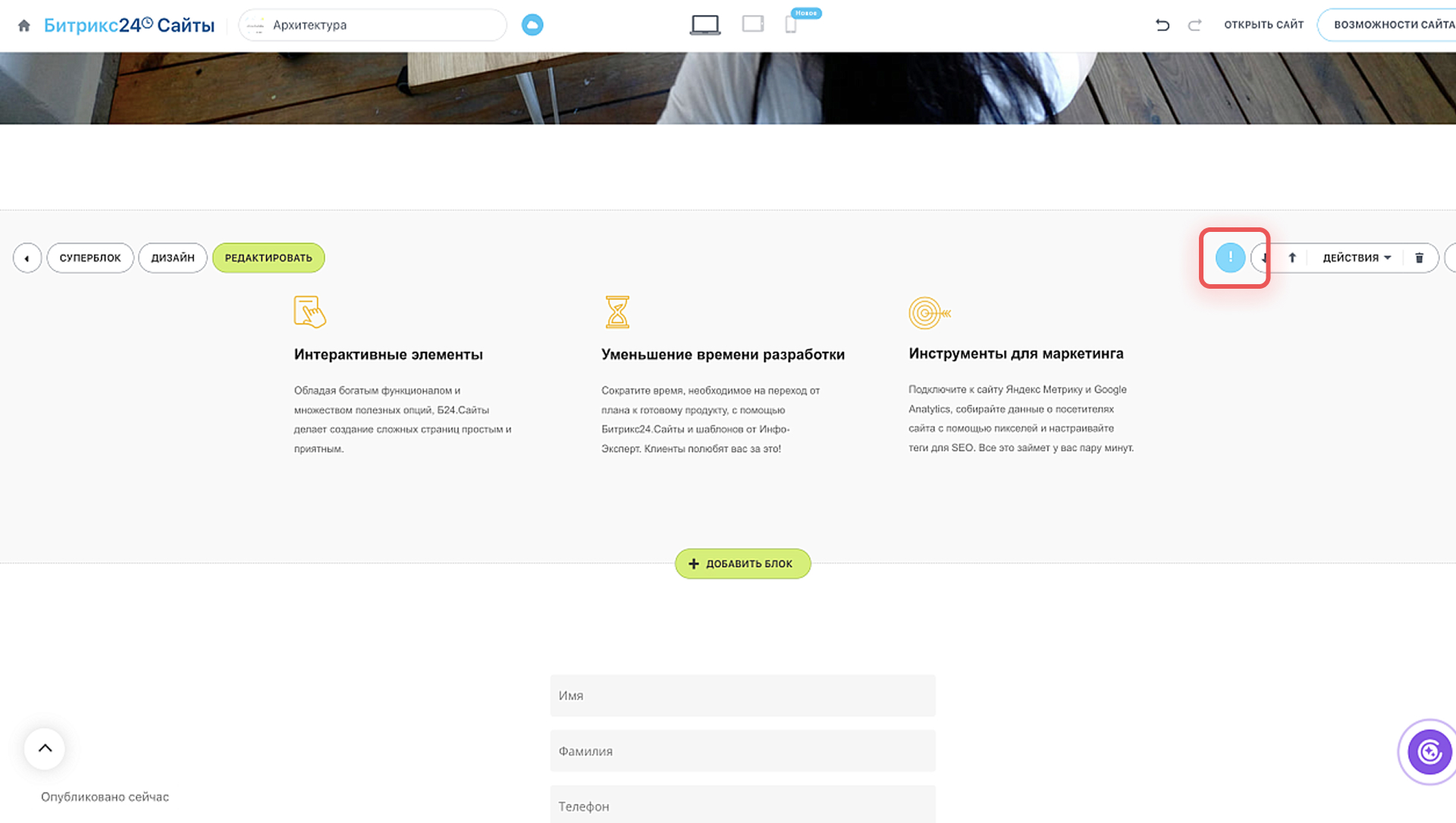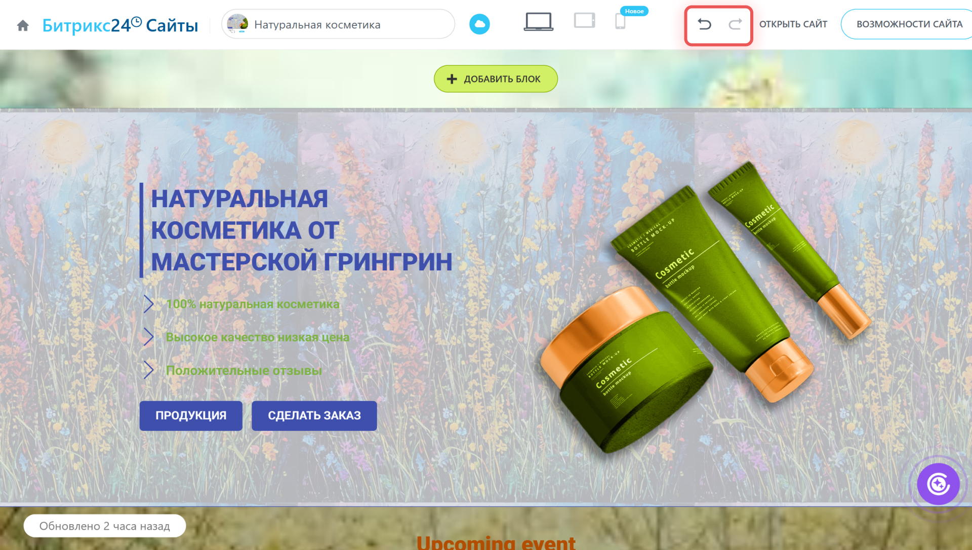 в верхней части экрана. Это удобно, если вы случайно изменили структуру страницы, удалили блок, хотите восстановить предыдущий вариант оформления и так далее.