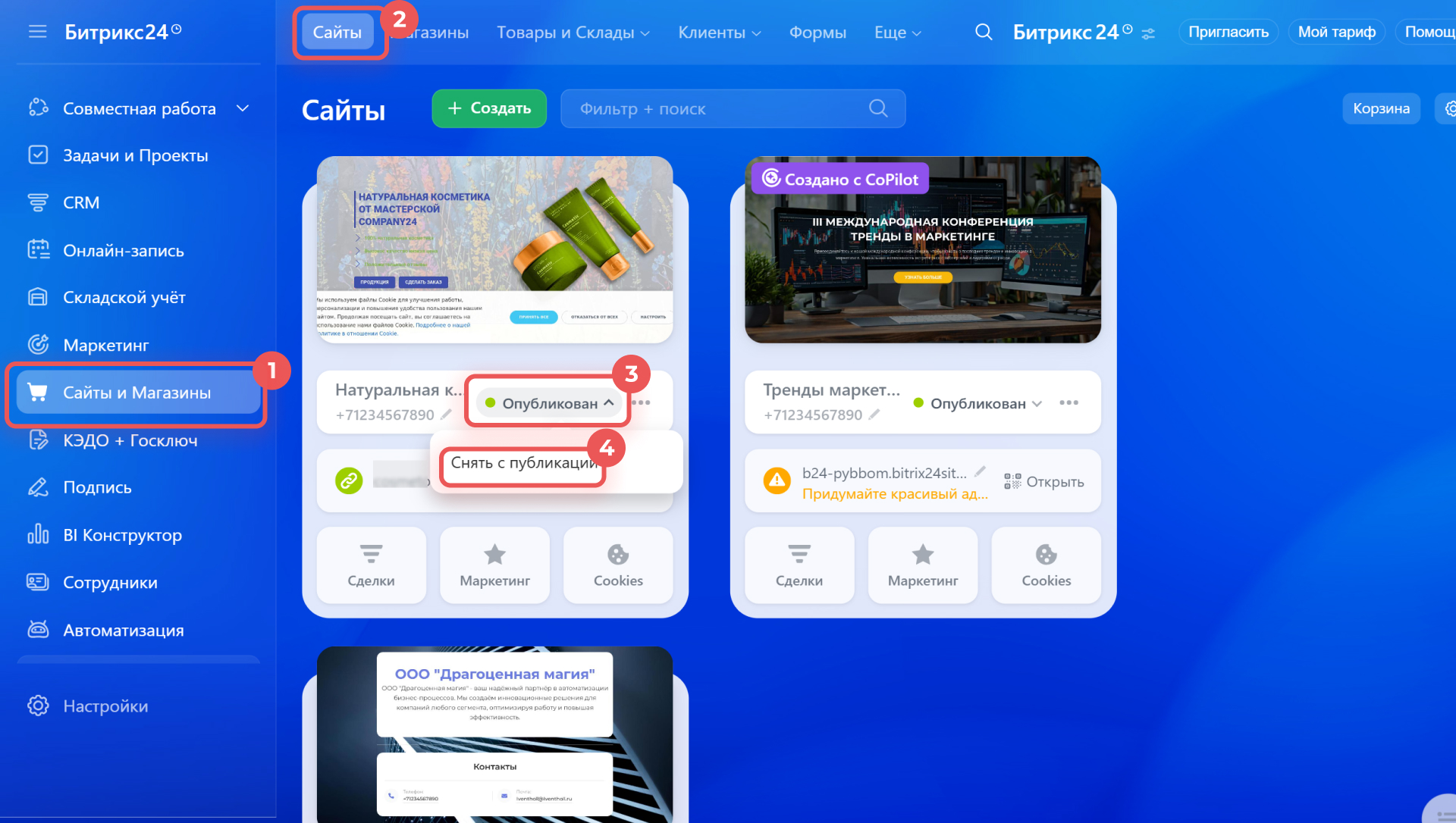 3–4. Нажмите на статус рядом с названием и кликните Снять с публикации — сайт останется в вашем Битрикс24, но пользователи не смогут его открыть. Позже вы сможете снова его опубликовать.
