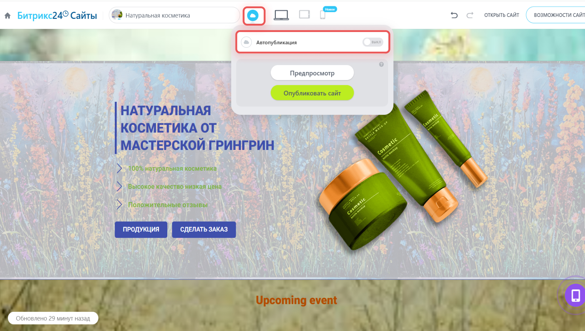 Если планируете вносить на сайт изменения — отключите автопубликацию. Откройте любую страницу сайта, нажмите на значок
